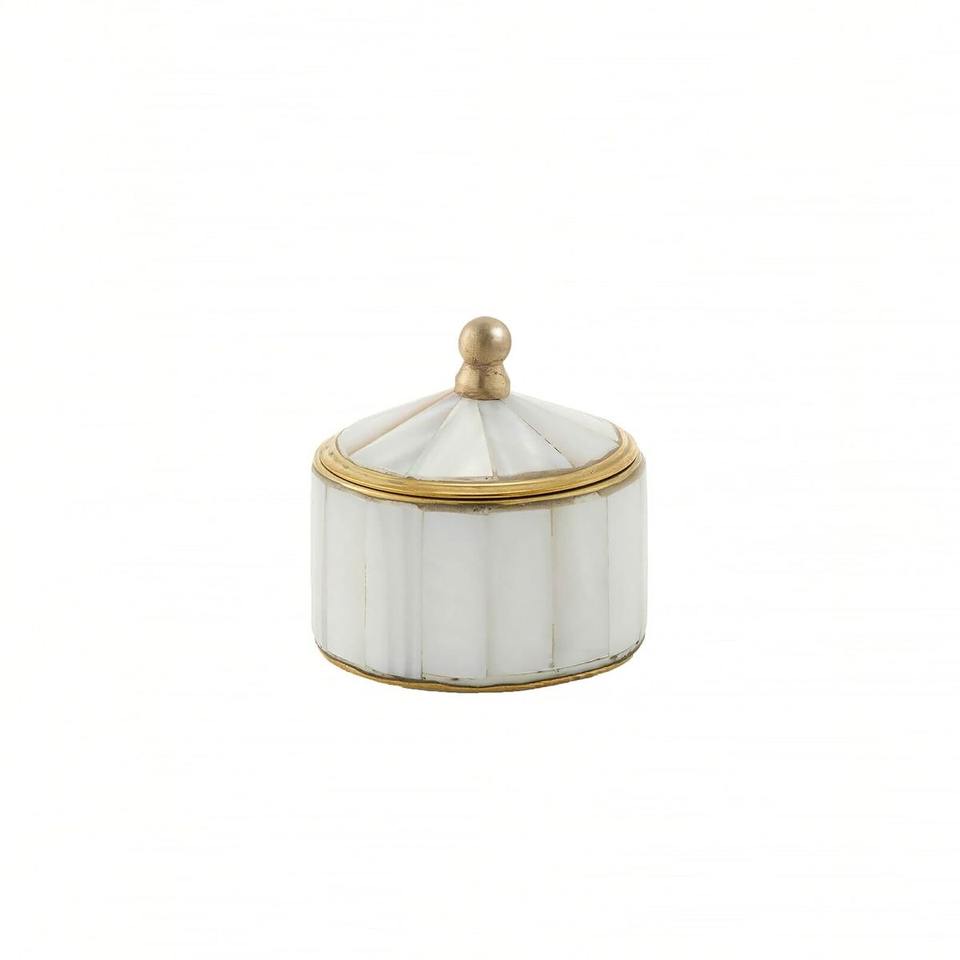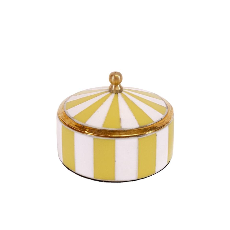 กล่องเก็บของเรซิ่นลายทางสีเหลืองขาวสุดหรู พร้อมฝาสีทองทรงกลม สำหรับใส่เครื่องประดับ ของตกแต่งโต๊ะเครื่องแป้ง ของขวัญพรีเมียม