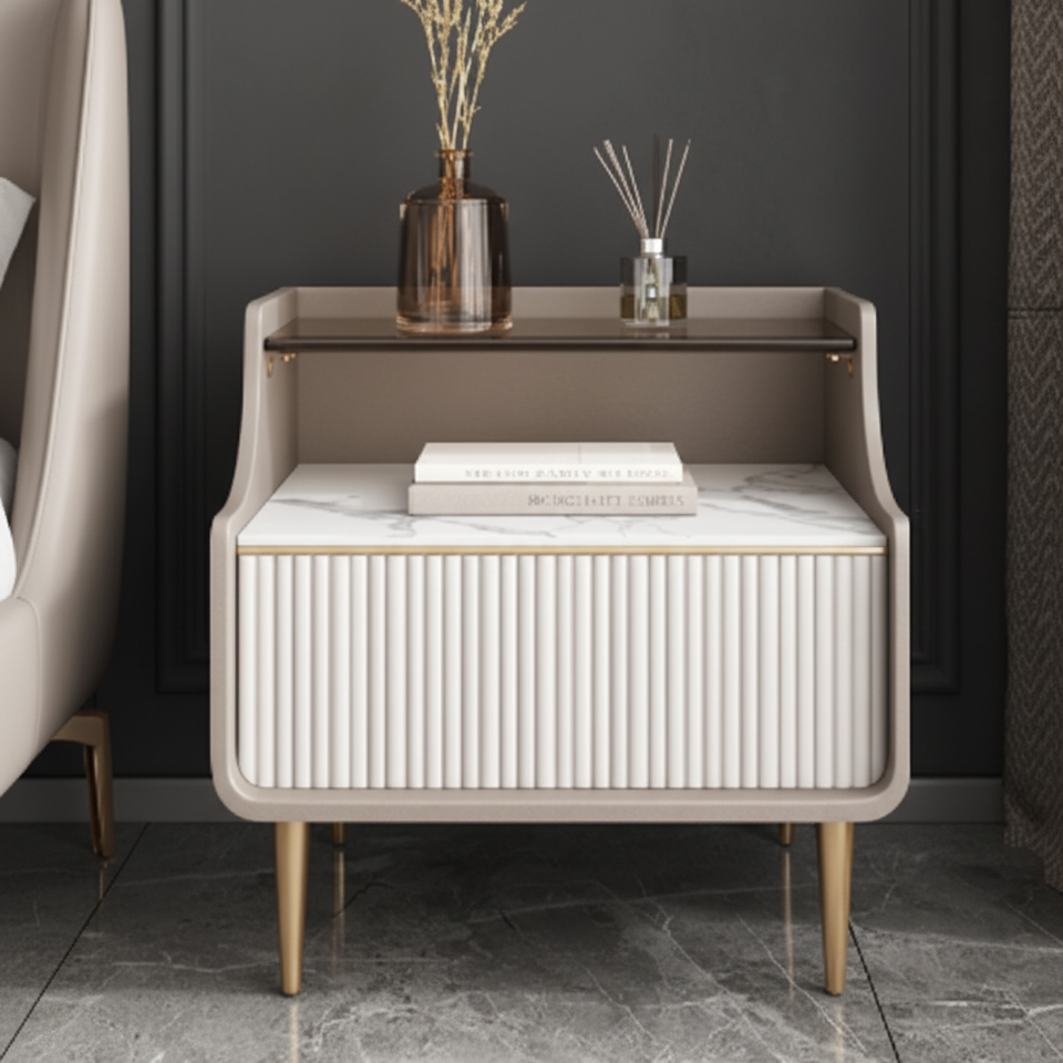 โต๊ะข้างเตียงสุดหรูพร้อมด้านบนเป็นหินอ่อนลิ้นชักสีขาวร่องชั้นกระจกแบบเปิดและขาเรียวทองเหลือง