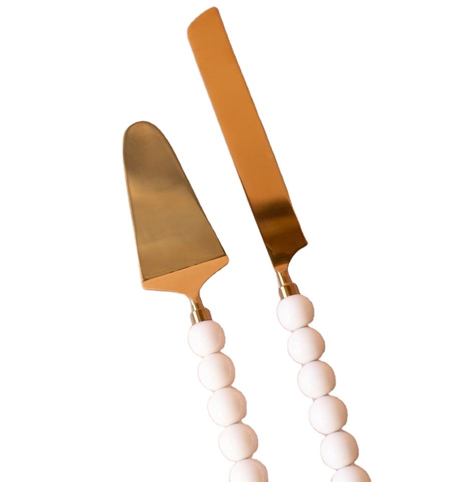 ชุดมีดและที่ตักเค้กทองคำสุดหรู พร้อมด้ามจับประดับลูกปัดสีขาว อุปกรณ์ตัดและเสิร์ฟขนมหวานอย่างมีสไตล์ เหมาะสำหรับตกแต่งงานแต่งงาน