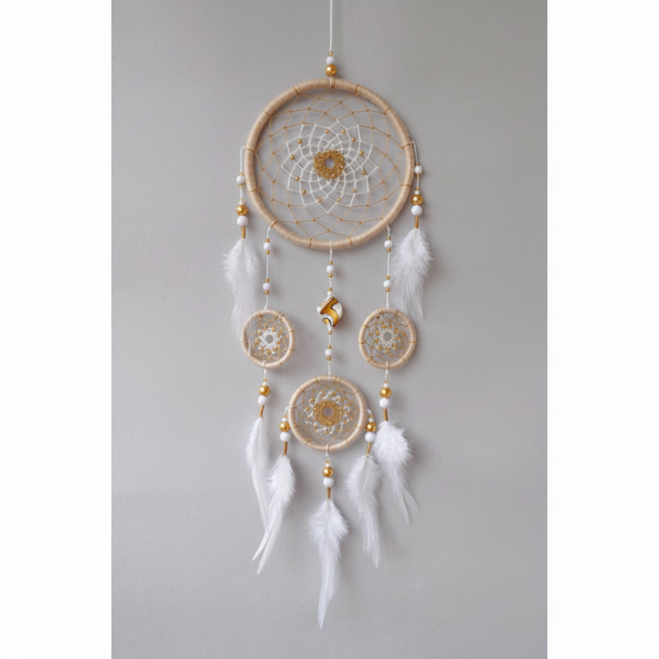 ลูกปัดสีทองสีขาวสุดหรูขนนกแบบหลายห่วงเครื่องดักฝันที่จับโบฮีเมียนตกแต่งบ้านสถานรับเลี้ยงเด็กสำหรับงานแต่งงานที่บ้านเครื่องประดับป้องกันทางจิตวิญญาณ