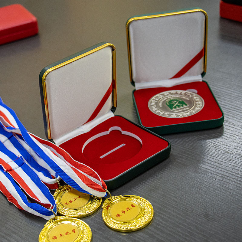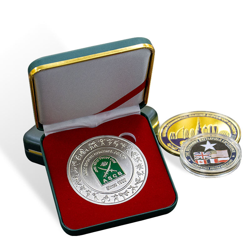 กล่องใส่เหรียญหนังสีเขียวสไตล์โมเดิร์นสุดหรู พร้อมขอบสีทอง สำหรับจัดแสดงตราสัญลักษณ์และเหรียญ งานฝีมือโลหะคุณภาพทำมือ
