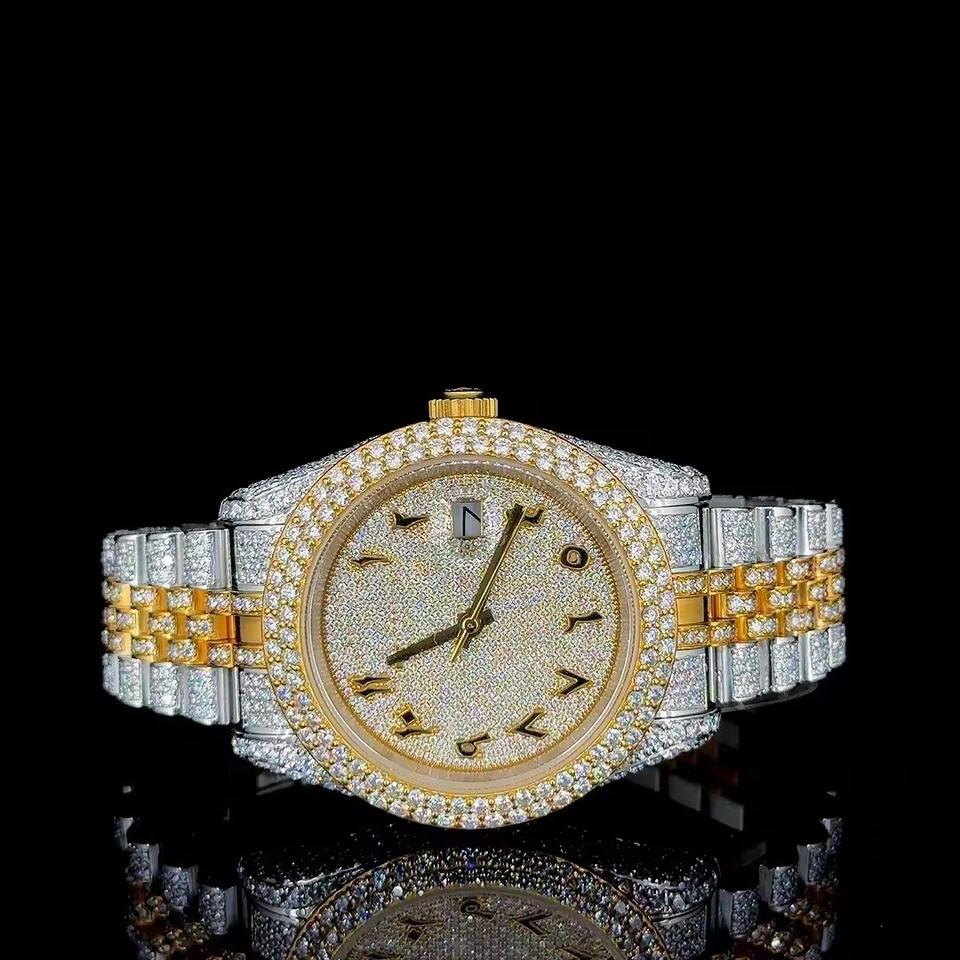 นาฬิกาหรูสไตล์ฮิปฮอปประดับเพชรโมอิสซาไนต์สำหรับผู้ชาย ตัวเรือนสีทอง หน้าปัดเพชรเต็มเรือน สายพรีเมียม ดีไซน์ทันสมัยโดดเด่น