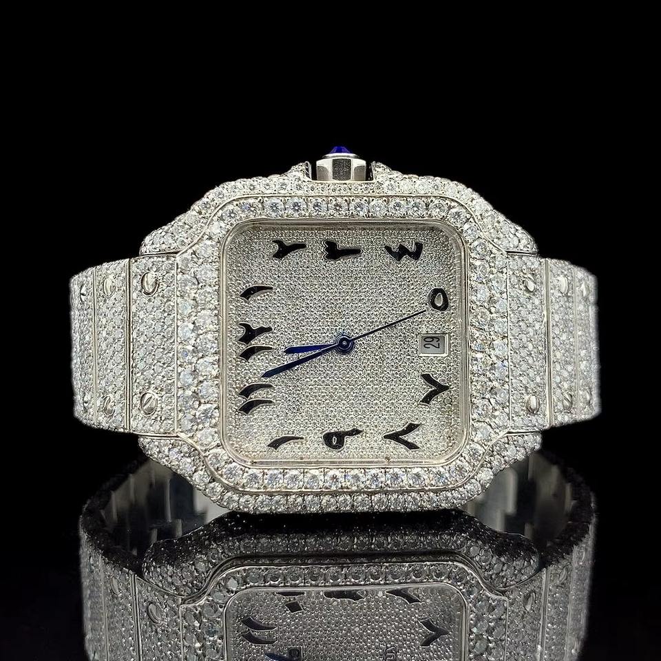 นาฬิกาข้อมือหรูหราประดับเพชร หน้าปัดทรงสี่เหลี่ยม ขอบคริสตัล ตัวเลขแบบอารบิก สายเงิน สำหรับผู้ชายและผู้หญิง