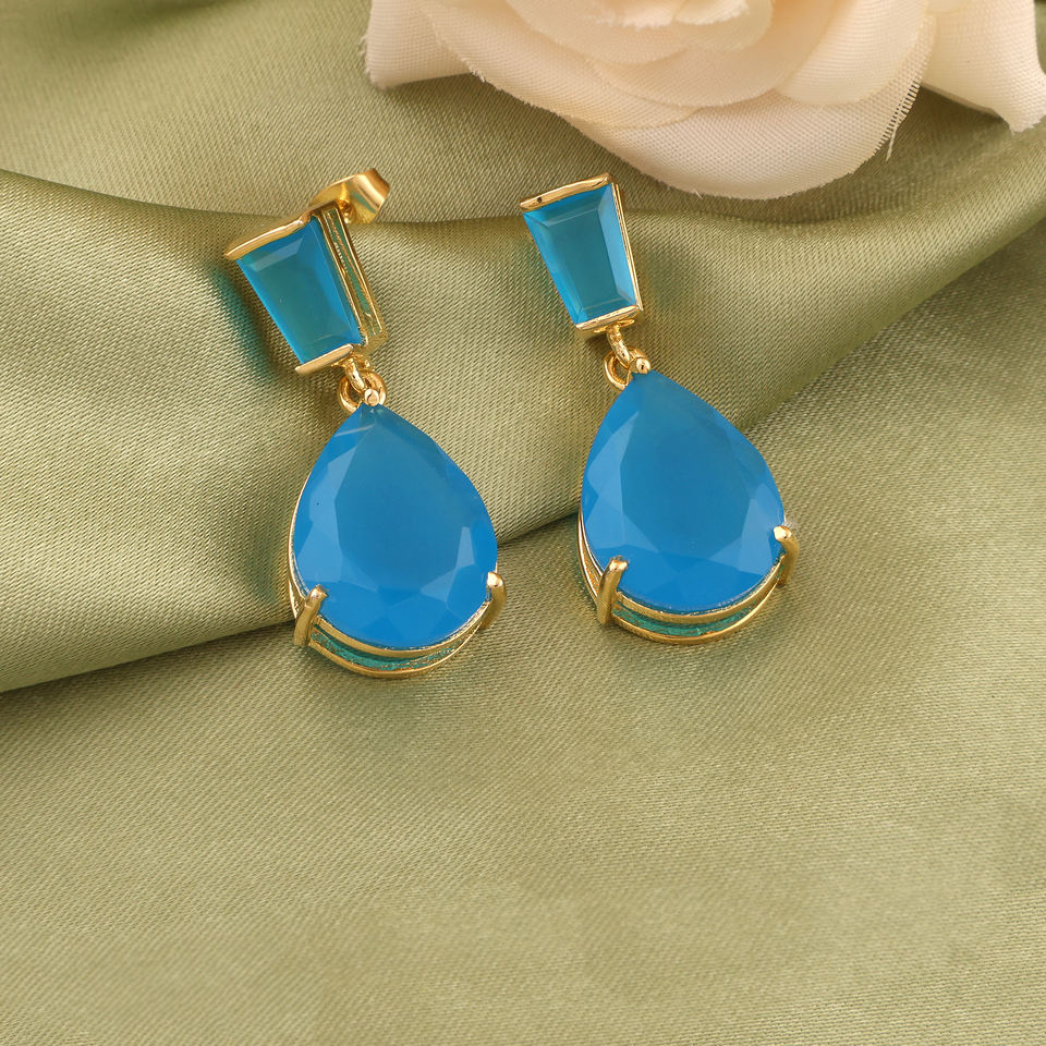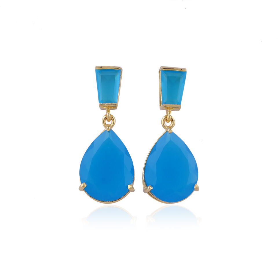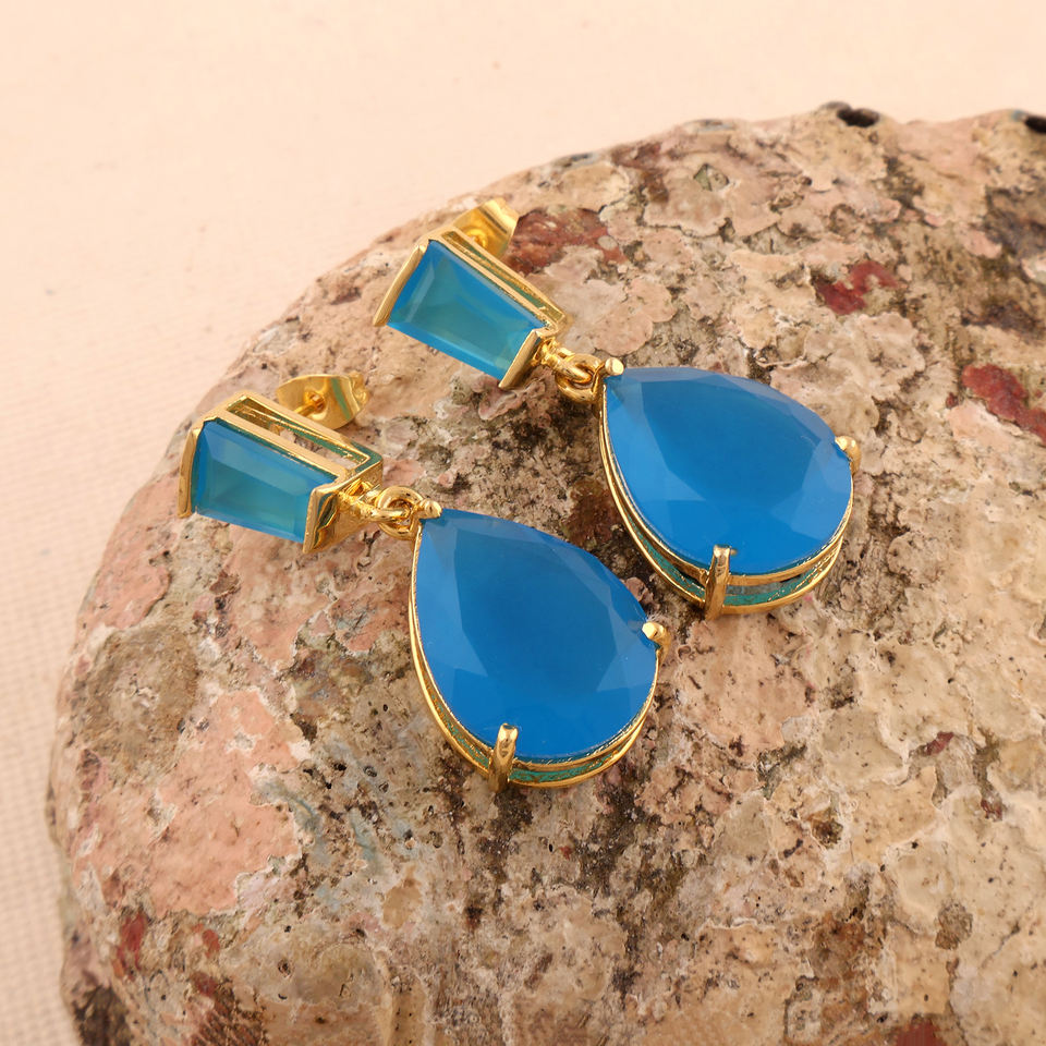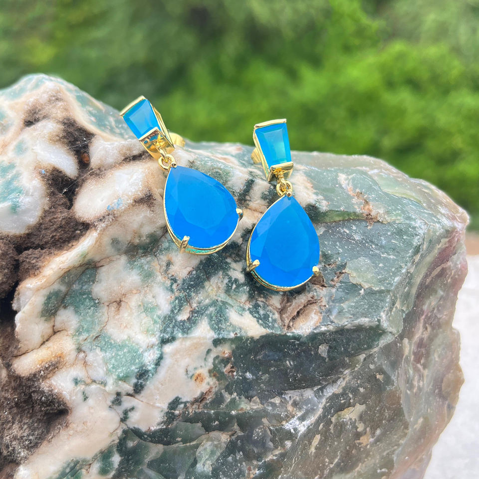 เครื่องประดับสุดหรูต่างหูเม็ดเดี่ยวประดับพลอยคาลซิโดนีสีฟ้าต่างหูทองเหลืองทำมือเครื่องประดับแฟชั่นต่างหูชุบทอง18K สำหรับผู้หญิง