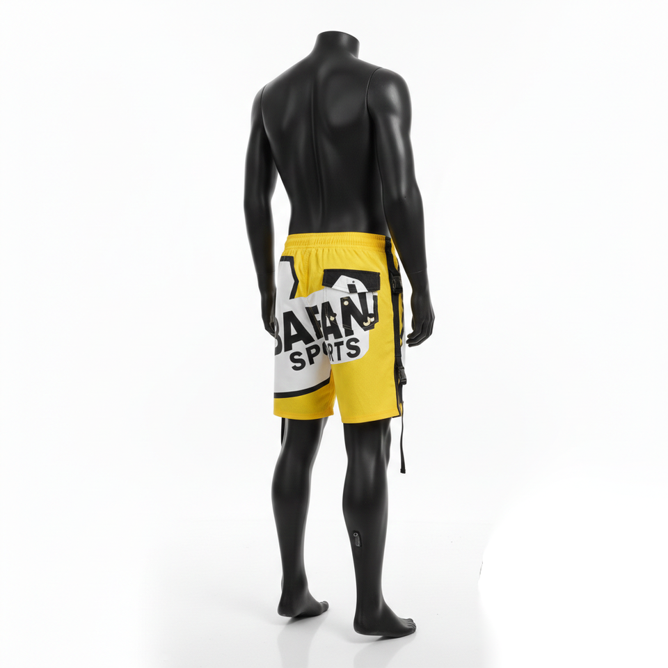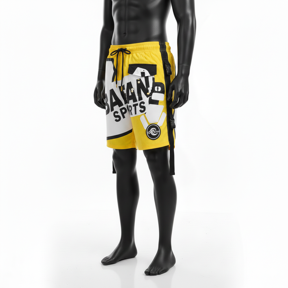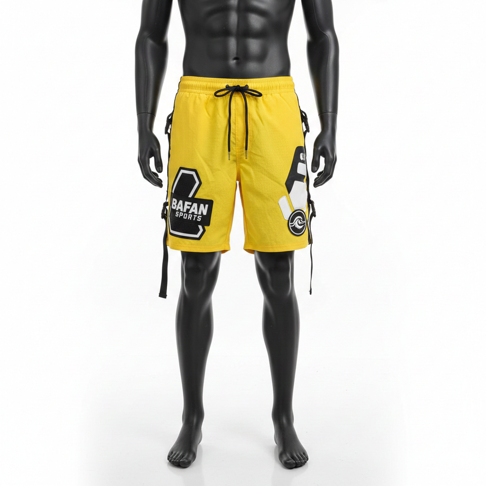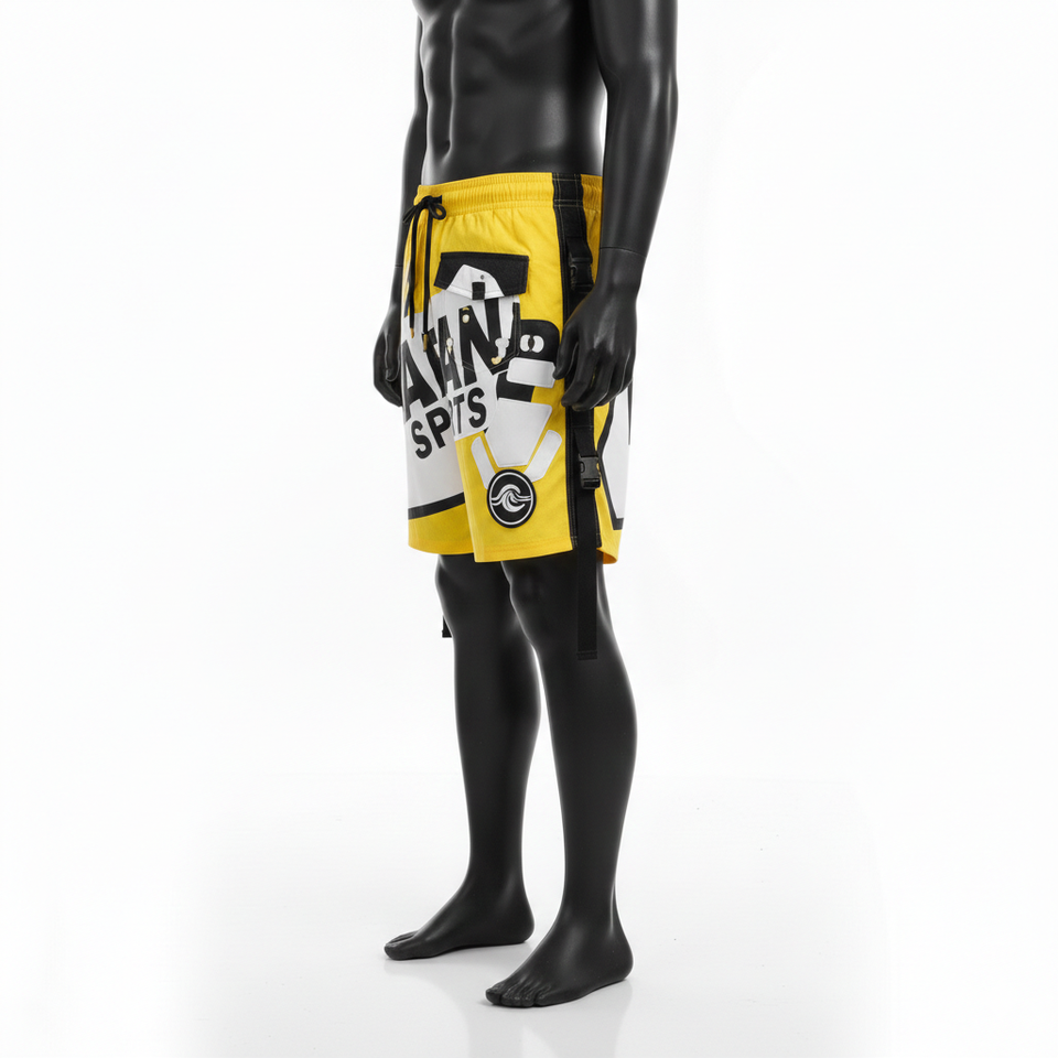 กางเกงว่ายน้ำชายผ้าไมโครไฟเบอร์โพลีเอสเตอร์อย่างดี สีเหลืองสด ด้านข้างมีสายรัดแบบคาร์โก้ พิมพ์ลายโลโก้ด้วยเทคนิคฮีททรานเฟอร์
