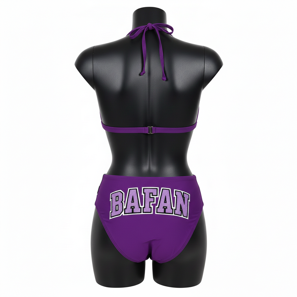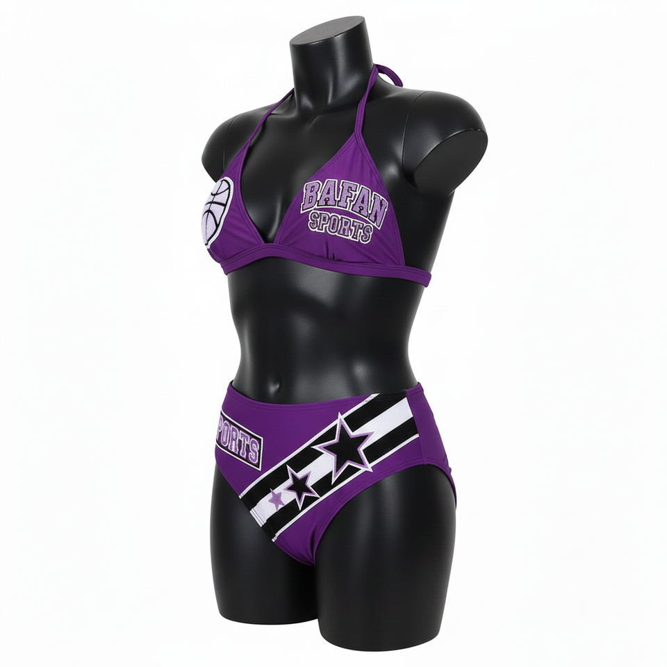 ชุดบิกินี่ผ้าโพลีเอสเตอร์ผสมสแปนเด็กซ์สุดหรู สีม่วง เนื้อผ้านุ่มยืดหยุ่น แต่งแถบดาวตัดสี พร้อมแผ่นโลโก้ปัก สำหรับผู้หญิง