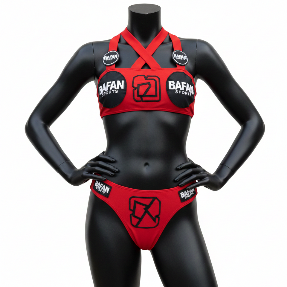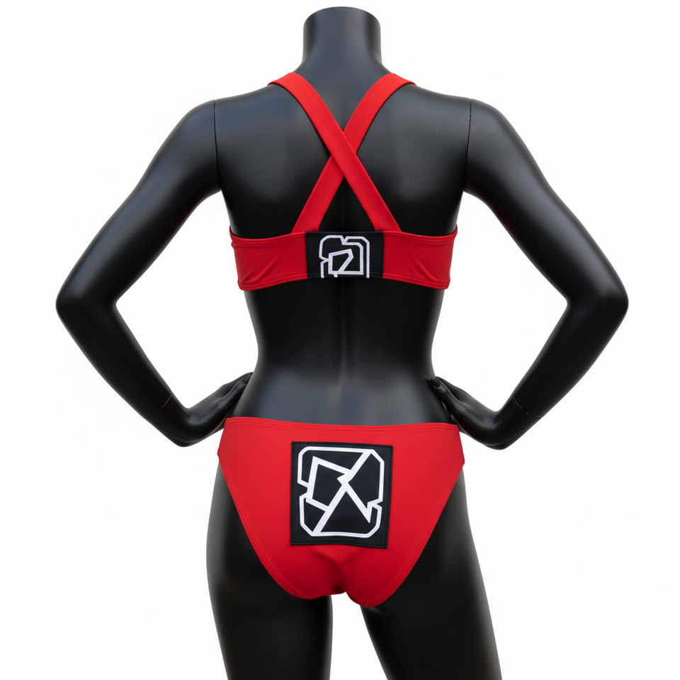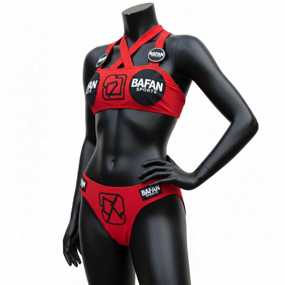 ชุดบิกินี่ผ้าโพลีเอสเตอร์ผสมสแปนเด็กซ์สุดหรู สีแดงดำ เนื้อผ้านุ่มยืดหยุ่น พร้อมแผ่นโลโก้ปัก และโลโก้แบบรีดร้อน สำหรับผู้หญิง