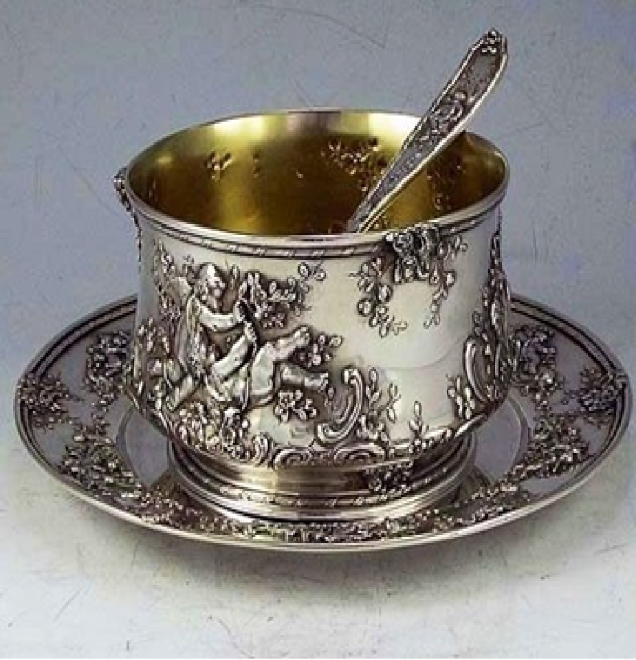 ชามซุปทรงหรูหราสีเงินลายริ้ว พร้อมถาดเสิร์ฟเข้าชุด หูจับลายสลักตกแต่ง จำหน่ายในราคาขายส่ง