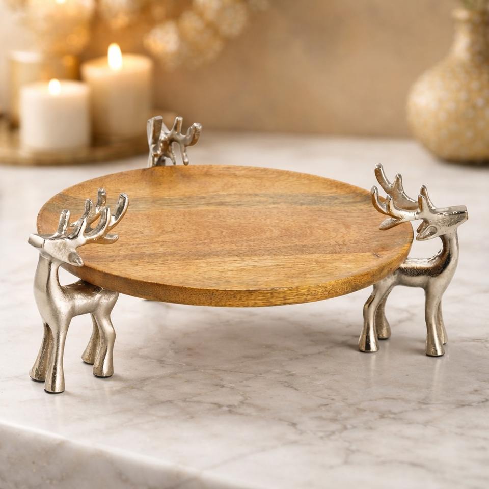 ถาดเสิร์ฟสุดหรู ถาดเสิร์ฟไม้พร้อมขาตั้งโลหะ ถาดไม้ตกแต่ง ถาดเสิร์ฟดีไซน์เนอร์ ถาดตกแต่งบ้านระดับพรีเมียม