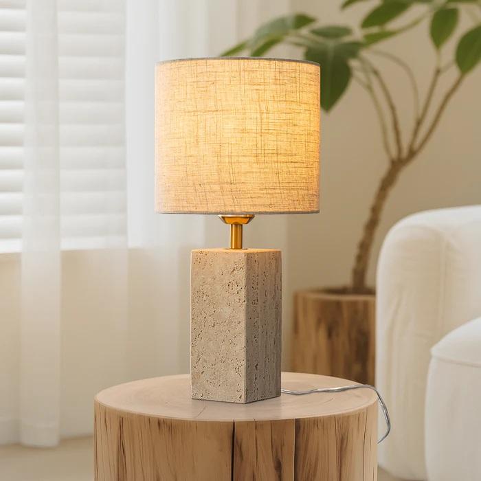 โคมไฟตั้งโต๊ะหินทราเวอร์ทีนสุดหรู พร้อมโป๊ะผ้าลินินสีเบจ ฐานทรงบล็อกแข็งแรง ให้แสงนุ่มนวล เหมาะสำหรับตกแต่งบ้าน