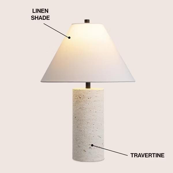 โคมไฟตั้งโต๊ะหินทราเวอร์ทีนสุดหรู พร้อมฐานทรงกระบอกมีเท็กซ์เจอร์ โคมไฟผ้าทรงกลมให้แสงนุ่มนวล เหมาะสำหรับตกแต่งบ้านสไตล์โมเดิร์น