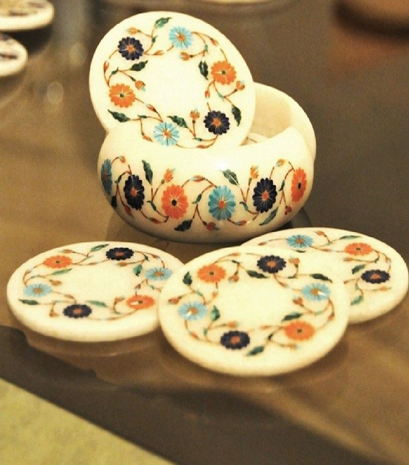 ชุดจานรองแก้วทรงกลมลายหินอ่อนสีขาวสุดหรูพร้อมลายดอกไม้หลากสีที่สวยงามมีจำหน่ายในราคาขายส่ง