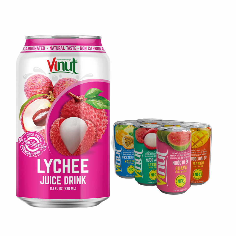 เครื่องดื่มน้ำลิ้นจี่ vinut 330มล. ไม่มีน้ำตาล OEM/ODM ฉลากส่วนตัวตัวอย่างฟรีจากผู้ผลิตเวียดนาม