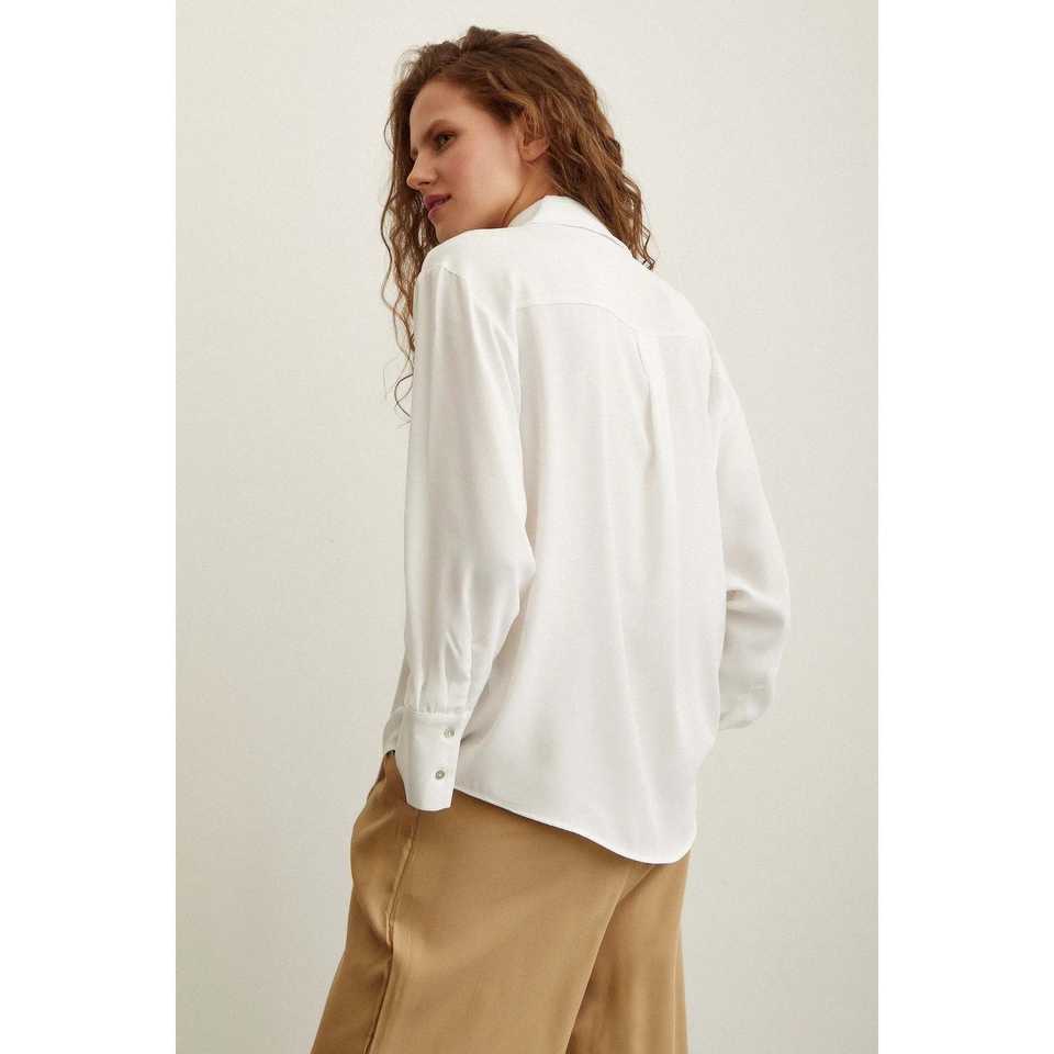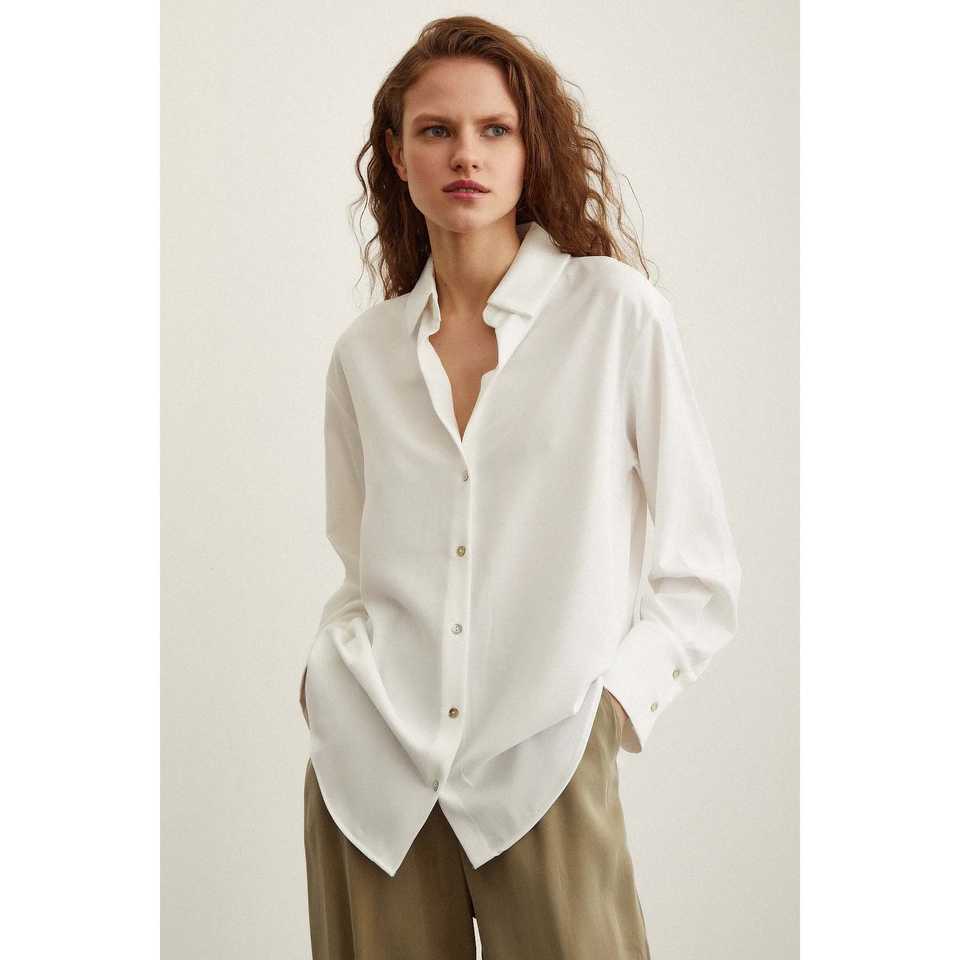 เสื้อเชิ้ตผ้าไลคร่าซาตินสีเอครูสำหรับผู้หญิง แบบติดกระดุม สไตล์มินิมอล ใส่ได้ทุกวัน