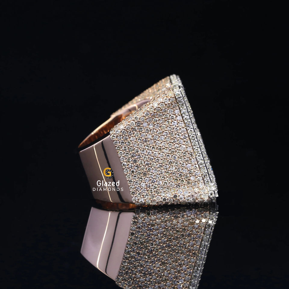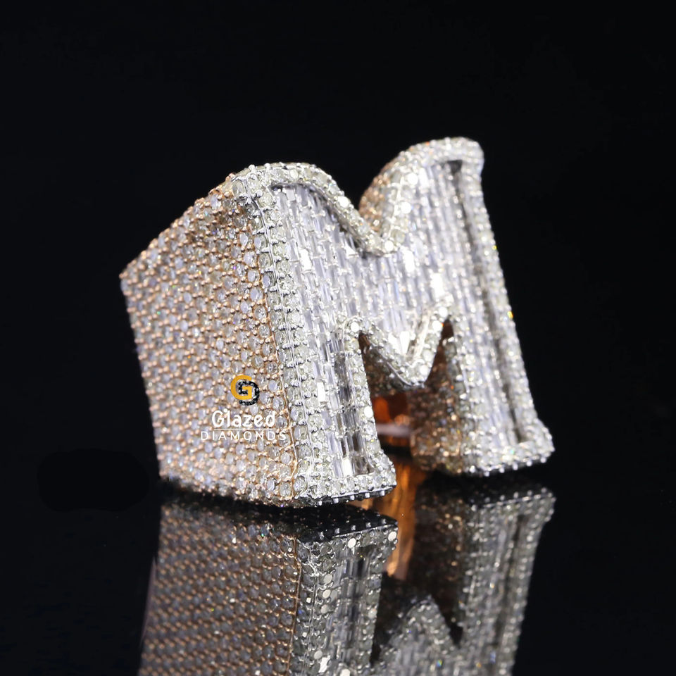 แหวนตัวอักษร M ถูกทำให้เย็นลงอย่างสมบูรณ์ใน14kt โรสโกลด์พร้อมกรอบกลมเพชรที่ปลูกในห้องปฏิบัติการที่มีความชัดเจน VVS