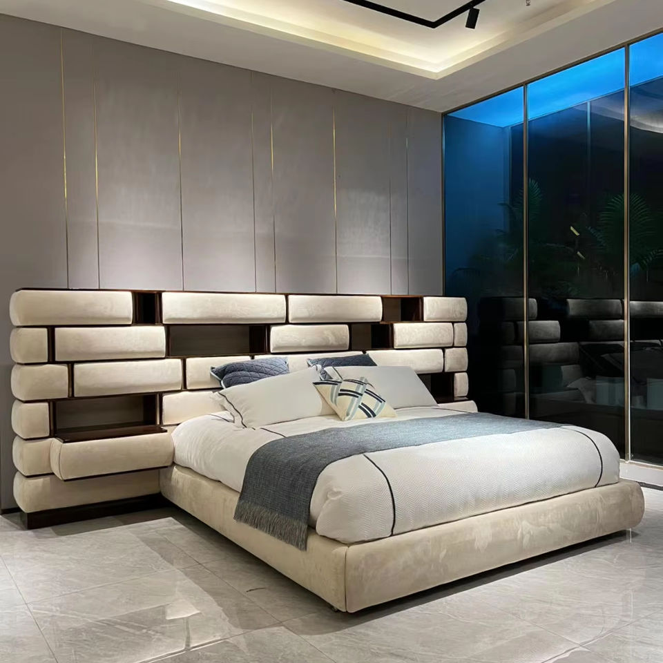 เตียงขนาดใหญ่สไตล์อิตาเลียนหรูหราแบบเบาๆ รุ่น M R ดีไซน์โพสต์โมเดิร์น หุ้มด้วยหนังกลับ สำหรับบ้านพักอาศัย วิลล่า ห้องนอนใหญ่ เตียงคู่