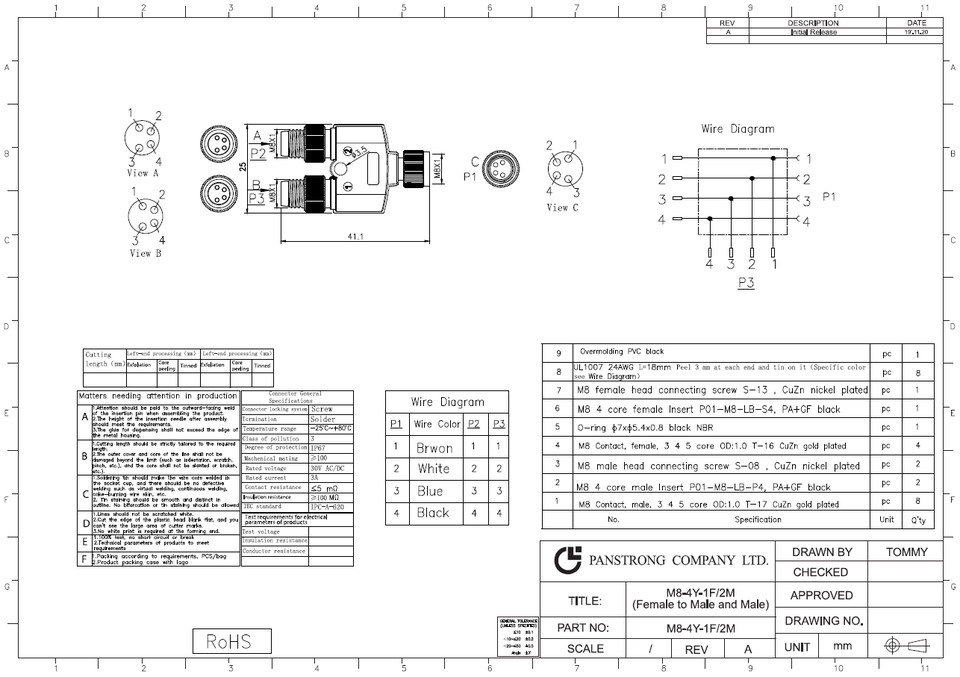 ตัวเชื่อมต่อแบบแยก M8-4Y-1F-2M ชนิด Y แบบ 4 ขา ตัวเมียเป็นตัวผู้ วัสดุทองแดง/สังกะสี หุ้มด้วยพีวีซี ป้องกันน้ำระดับ IP67 ผลิตในไต้หวัน