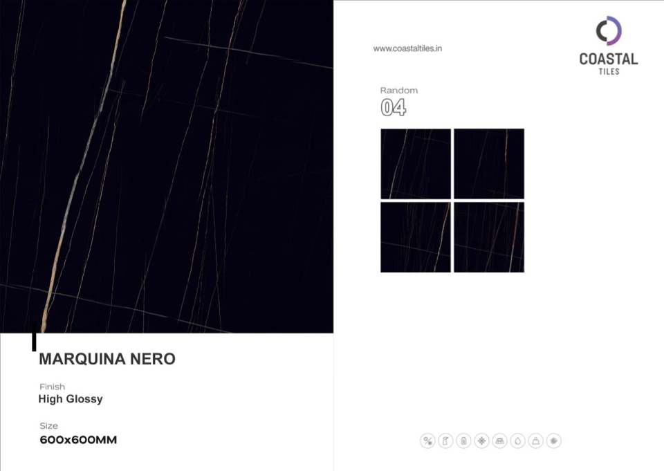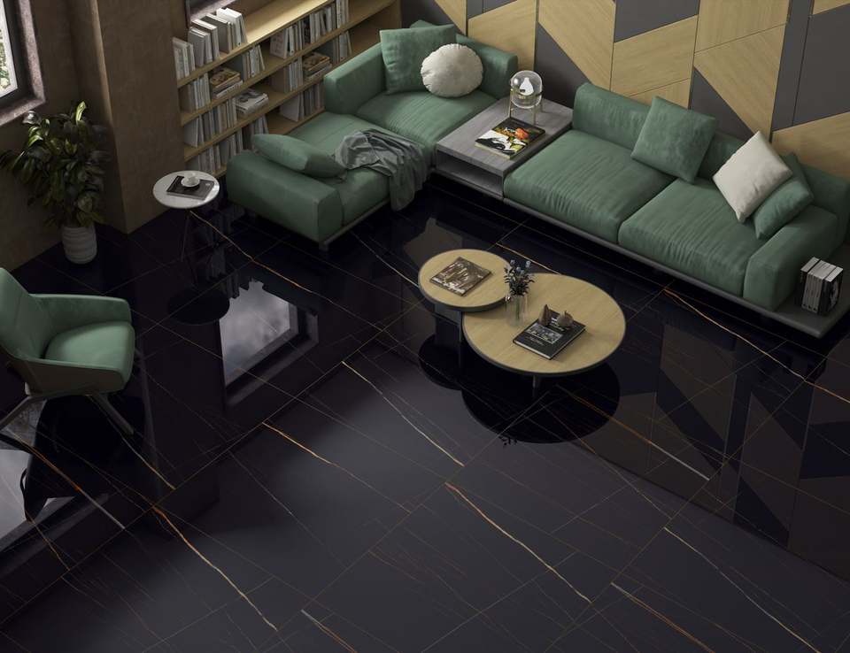 กระเบื้องปูพื้นพอร์ซเลน MARQUINA NERO ขนาด 600x600 มม. สีดำ เงาสูง คุณภาพพรีเมียม สำหรับตกแต่งภายใน ระดับท็อปเกรด AAA ทนไฟ