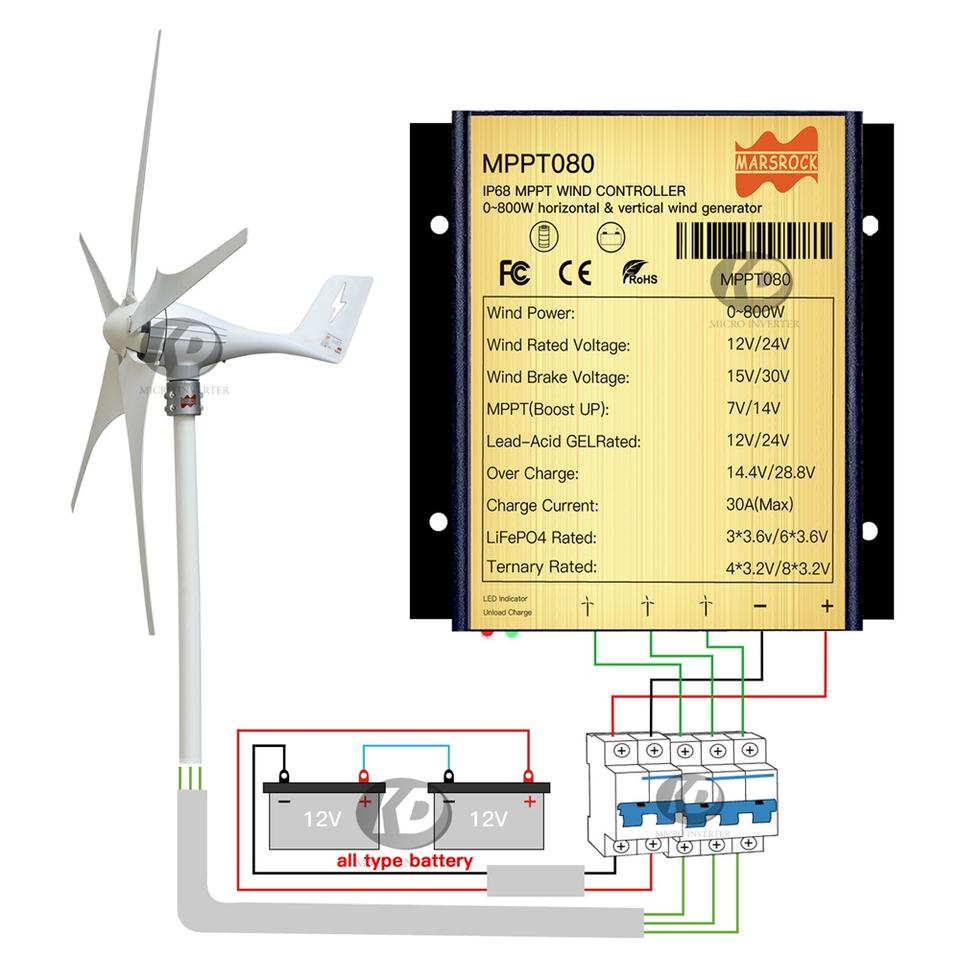 มาร์สร็อค MPPT080 IP68ควบคุมการปล่อยลม30A 0 ~ 800W เอาท์พุท DC 12/24V เครื่องกำเนิดกังหัน