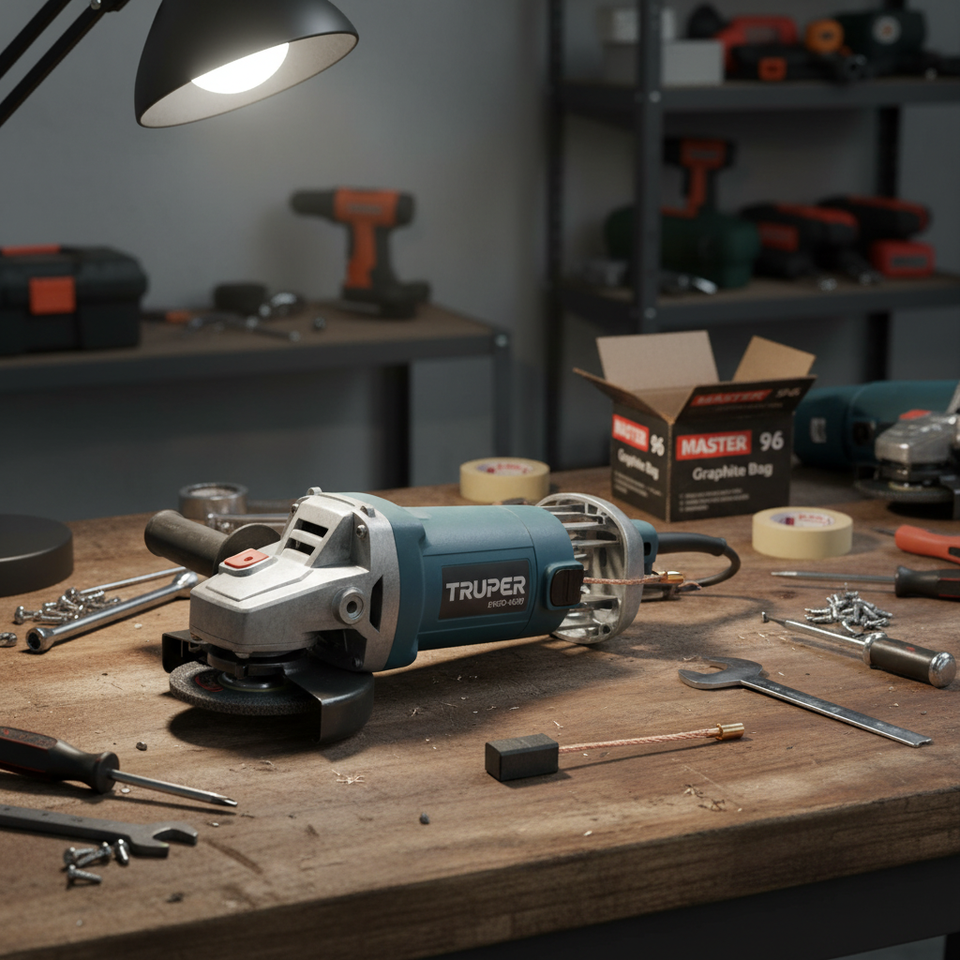 ถุงกราไฟต์ MASTER 96 พร้อมแปรงถ่านสำรอง 2 ชิ้น สำหรับเครื่องเจียรไฟฟ้าแบบมีสาย ERGO-4590 TRUPER