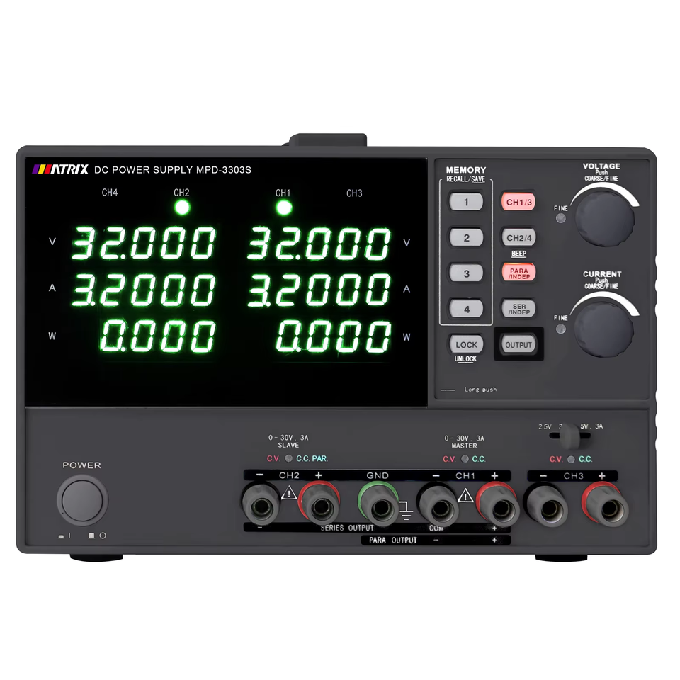 แหล่งจ่ายไฟแบบตั้งโต๊ะ DC แบบเชิงเส้น รุ่น MATRIX MPD Series สามช่องสัญญาณ 30V 3A 195W สำหรับงานอุตสาหกรรม ความแม่นยำสูง แบบตั้งโปรแกรมได้ พร้อมอินพุต AC