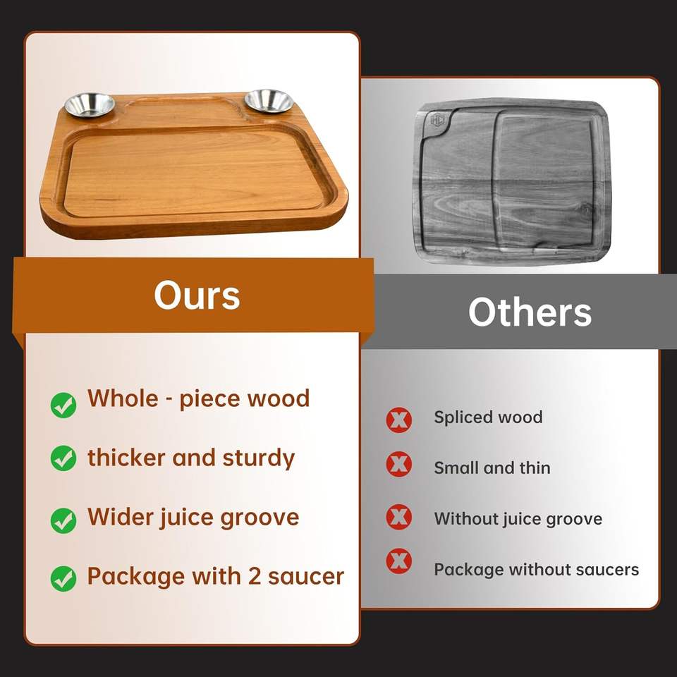 ชุดสเต็กไม้ MAVOTER ประกอบด้วยถ้วยซอส 2 ใบ ถาดเสิร์ฟ ร่องสำหรับน้ำผลไม้ กระดานชาร์กูเตอรีรักษ์โลก ขนาด 13x11 นิ้ว น้ำหนัก 0.93 กิโลกรัม ผลิตด้วยมือ
