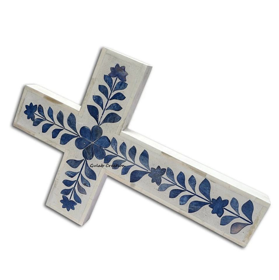 ไม้กางเขนแขวนผนังคริสเตียนฝังกระดูก MDF และสีน้ำเงินสำหรับตกแต่งบ้านและป้องกันดวงตาชั่วร้ายเครื่องประดับทางจิตวิญญาณ