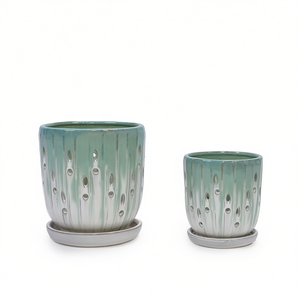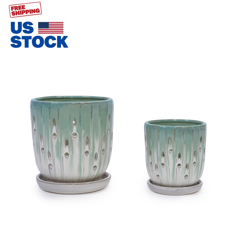 ชุดกระถางเซรามิก MDJ ทรงกลม สีเขียวขาว สไตล์อเมริกันสมัยใหม่ สำหรับปลูกดอกไม้ในร่มและกลางแจ้ง พร้อมรูระบายน้ำ ใช้ได้ทั้งในบ้านและสวน