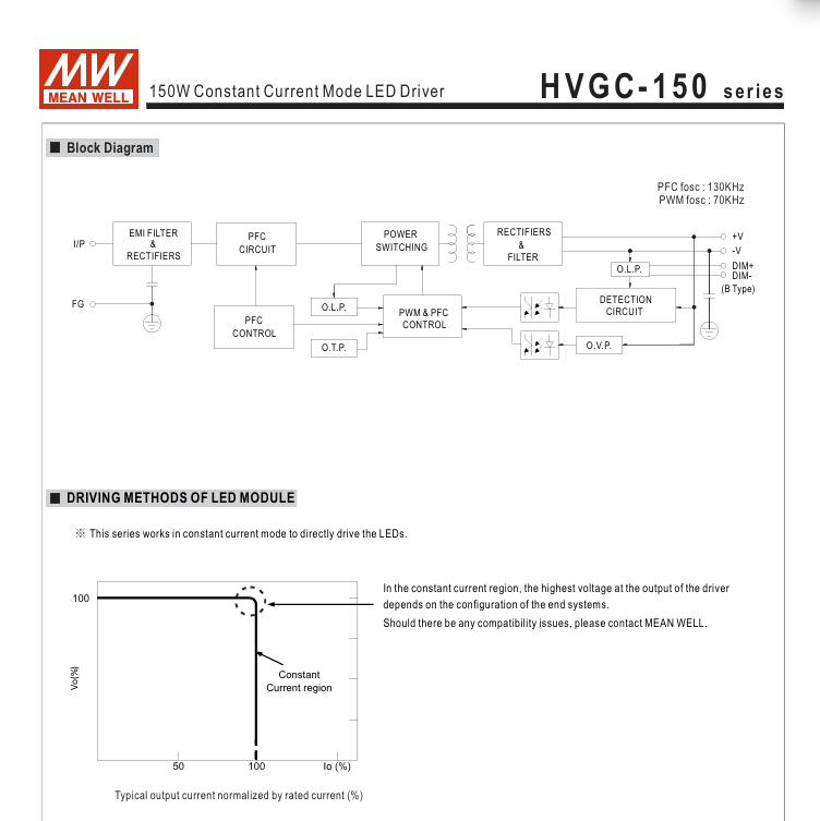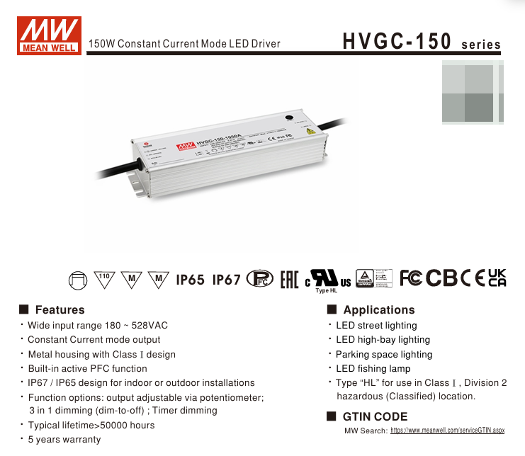 คุณสมบัติ:150.1 วัตต์ 1050 มิลลิแอมป์ 15-143 โวลต์ IP65 CC LED PS