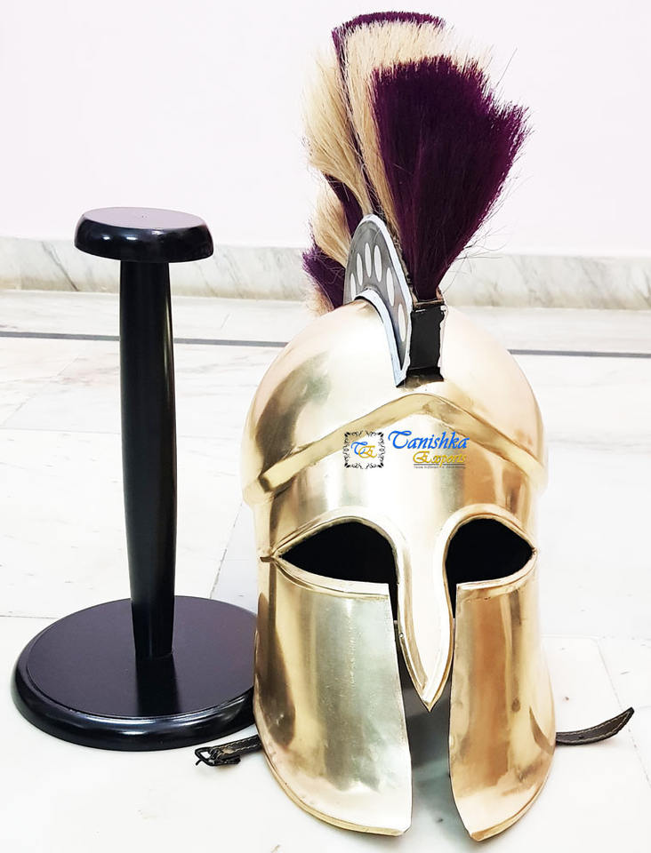 หมวกกันน็อคยุคกลางสำหรับคอสตูมฮาโลวีน,หมวกกันน็อกแบบโครินเธียนแนววินเทจกรีกทำจากทองเหลืองสายรัดทำจากเหล็กขนนกสีเหลืองและสีดำ