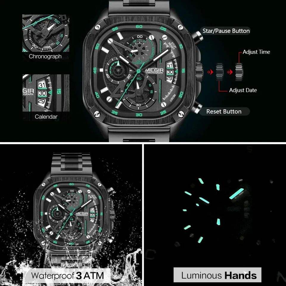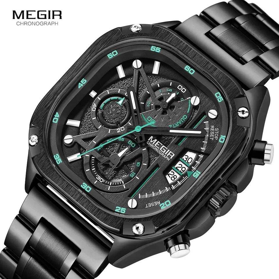 MEGIR 2217 นาฬิกาข้อมือผู้ชายหน้าปัดสี่เหลี่ยมควอตซ์แฟชั่นโครโนกราฟสายสแตนเลสโบราณกันน้ำ