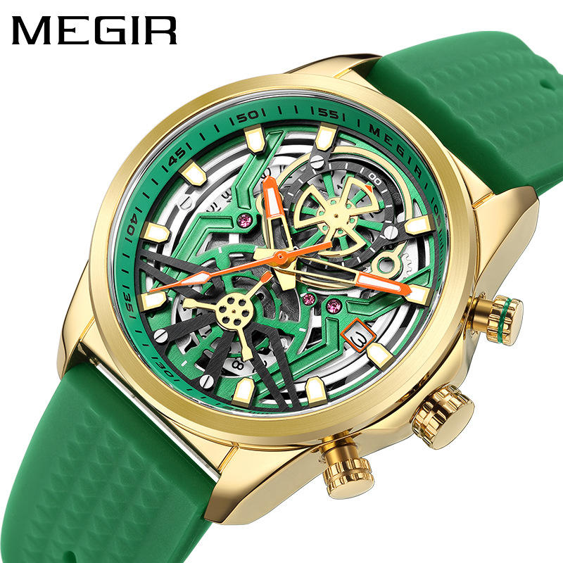 Megir นาฬิกาแฟชั่นผู้ชาย, นาฬิกาควอทซ์สายซิลิโคนมัลติฟังก์ชั่โครโนกราฟโลหะผสมเคส