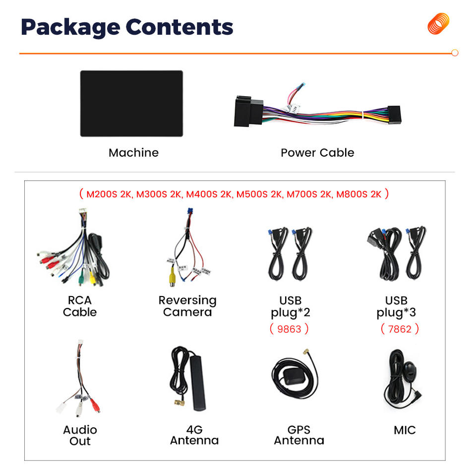 Usb, SD Card, 3G/4Gซิมการ์ด, Built-In WiFi, Packaging Box+Instruction manual, Machine, Power Cable, MIC, RCA Cable, Reversing camera, USB Plug x2, GPS Antenna, Fakra 4G Antenna, Fakra GPS Antenna, BTสัมพันธ์