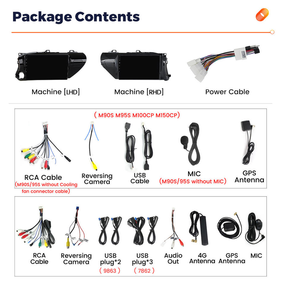 Usb, SD Card, 3G/4Gซิมการ์ด, Built-In WiFi, Packaging Box+Instruction manual, Machine, Power Cable, MIC, RCA Cable, Reversing camera, USB Plug x2, GPS Antenna, Fakra 4G Antenna, Fakra GPS Antenna, BT