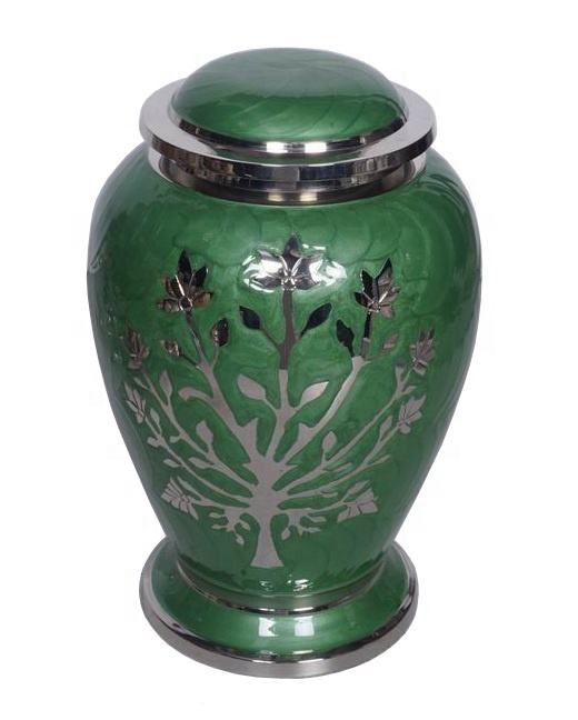 โกศโลหะทองเหลืองสีเขียวสำหรับผู้ใหญ่สำหรับขี้เถ้าของมนุษย์พร้อมโกศแกะสลักทำด้วยมือด้วยการตกแต่งที่หรูหรา