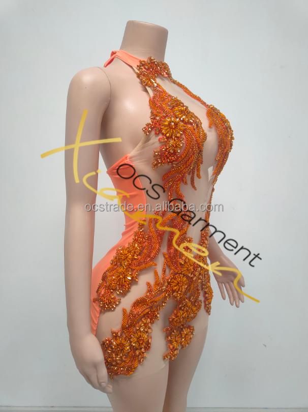 MF ชุดเดรสงานวันเกิดประดับพลอยเทียมสีส้มแบบคล้องคอแฮนด์เมดชุดเดรสปาร์ตี้คลับสุดเซ็กซี่สำหรับผู้หญิง