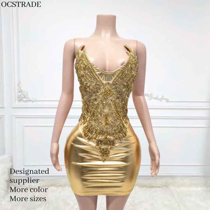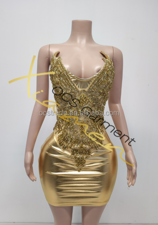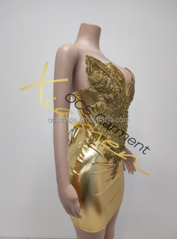 ชุดเดรสสั้นรัดรูปแบบสายเดี่ยวเปิดไหล่ประดับคริสตัลสีทองสำหรับผู้หญิงทันสมัย