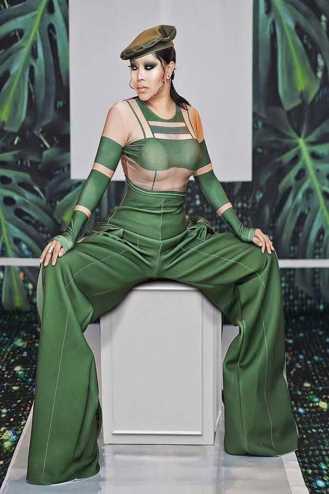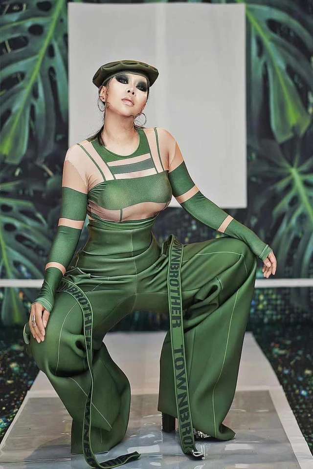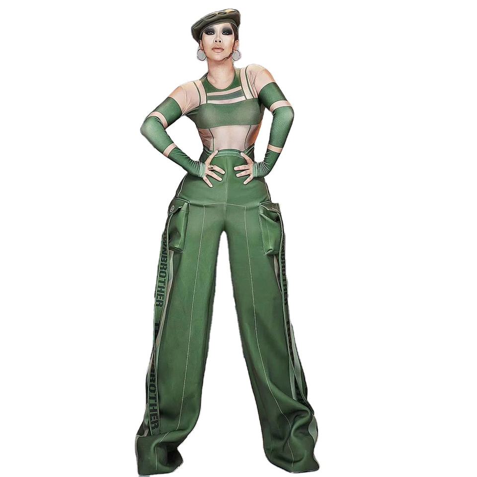 MF Wholesale Green Mesh Letter Print Long Color Block Sleeve Jumpsuit Pockets Loose Wide Leg Pants Rompers for Women