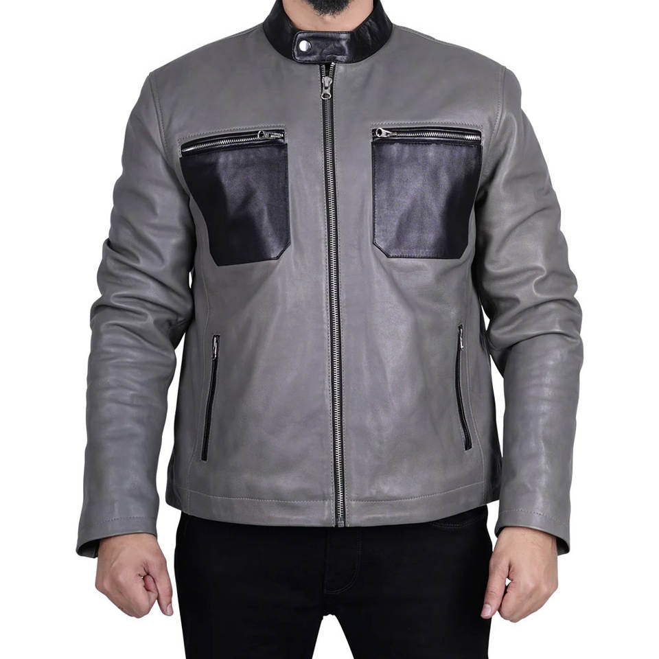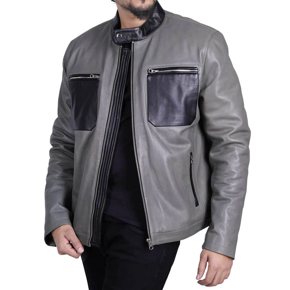 MICAH CORPORATION: เสื้อแจ็คเก็ตหนังสีเทาสำหรับผู้ชาย พร้อมปกคอจีนสีดำ กระเป๋าหน้าอกและกระเป๋าใส่ของที่มือ ติดกระดุมแป๊ก