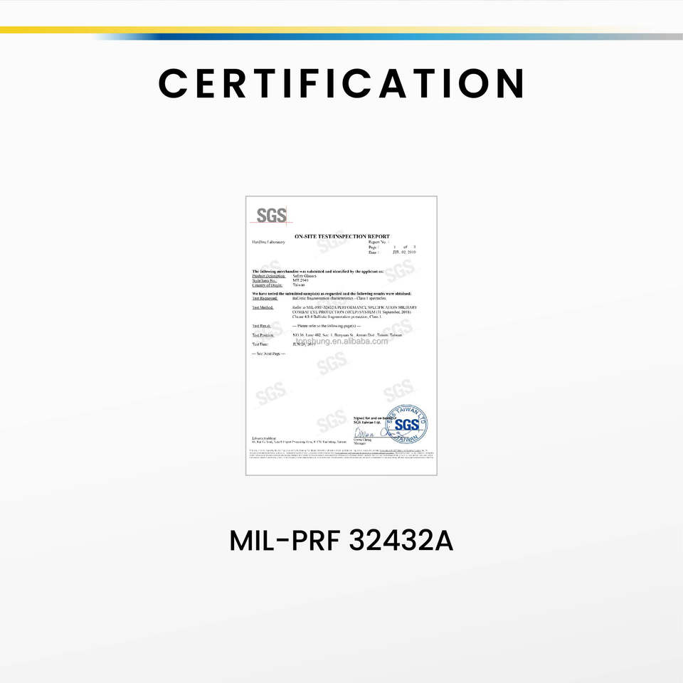 Certification:Ballistic fragmentation protection Class 2 of MIL-PRF-32432A