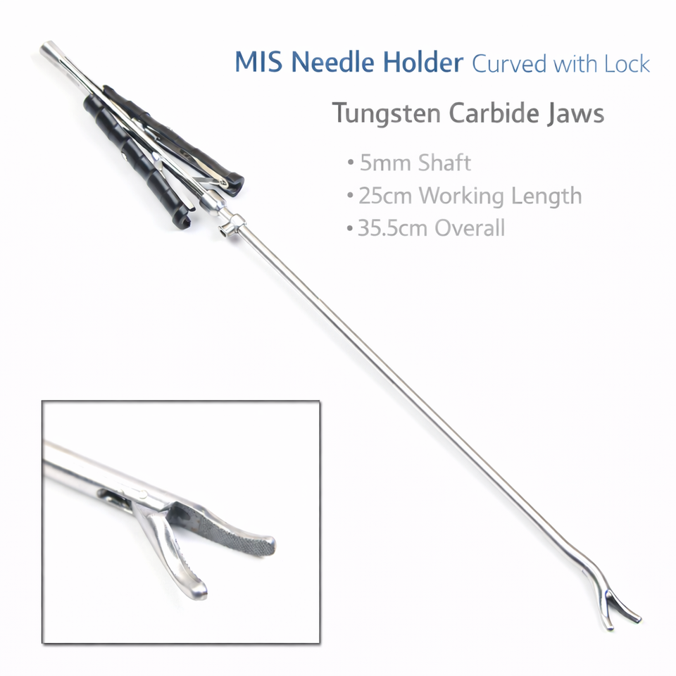 ที่จับเข็ม MIS แบบโค้งพร้อมตัวล็อค ปากจับทังสเตนคาร์ไบด์ แกนขนาด 5 มม. ความยาวใช้งาน 25 ซม. ความยาวรวม 35.5 ซม. – ZETOMEDPRO