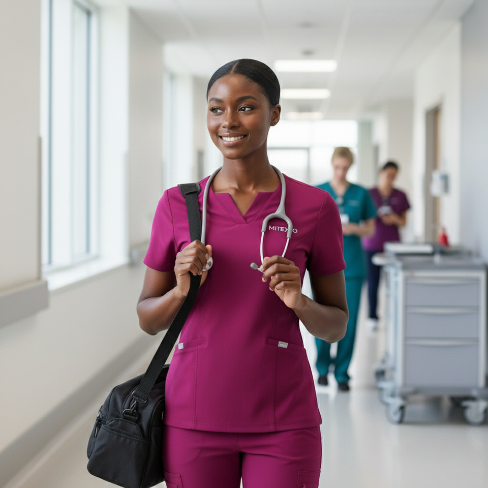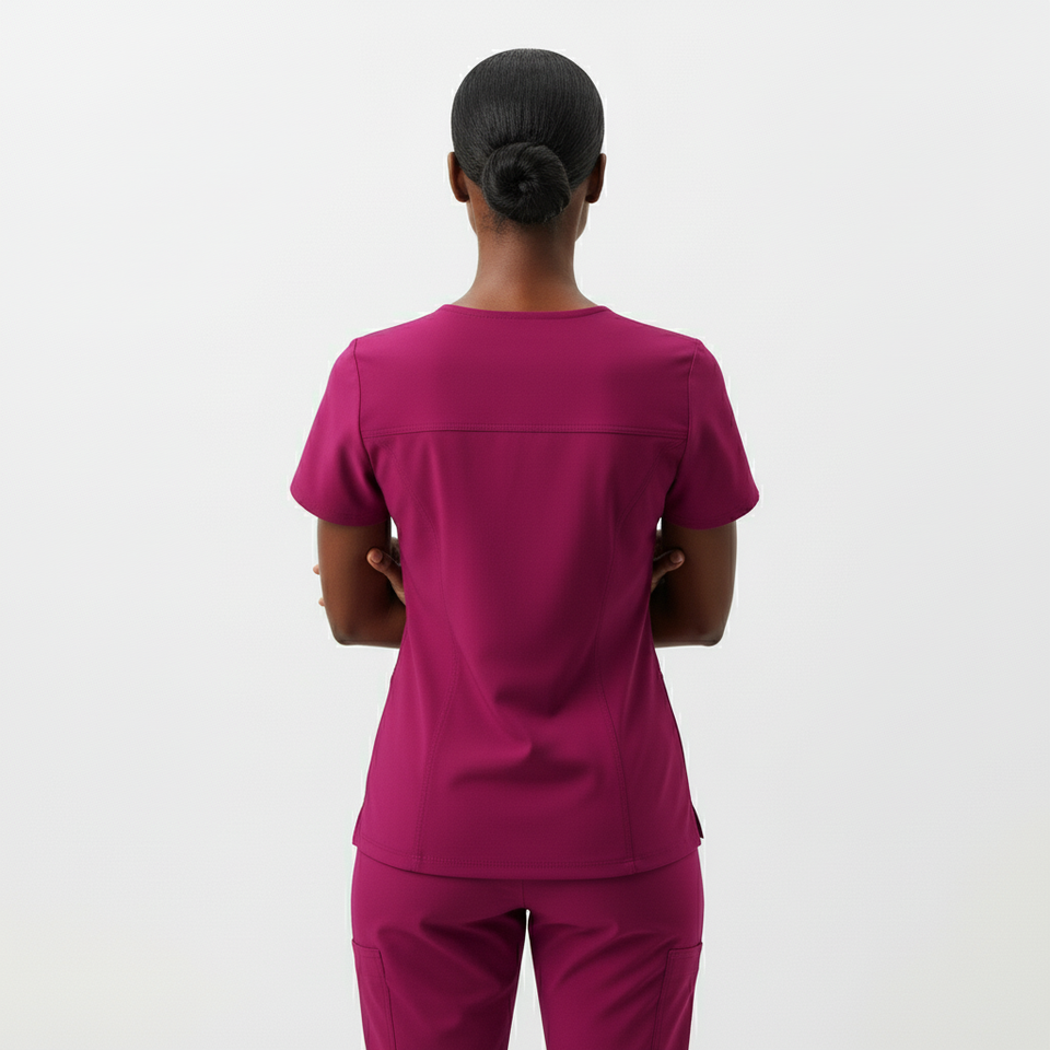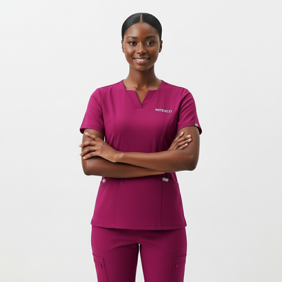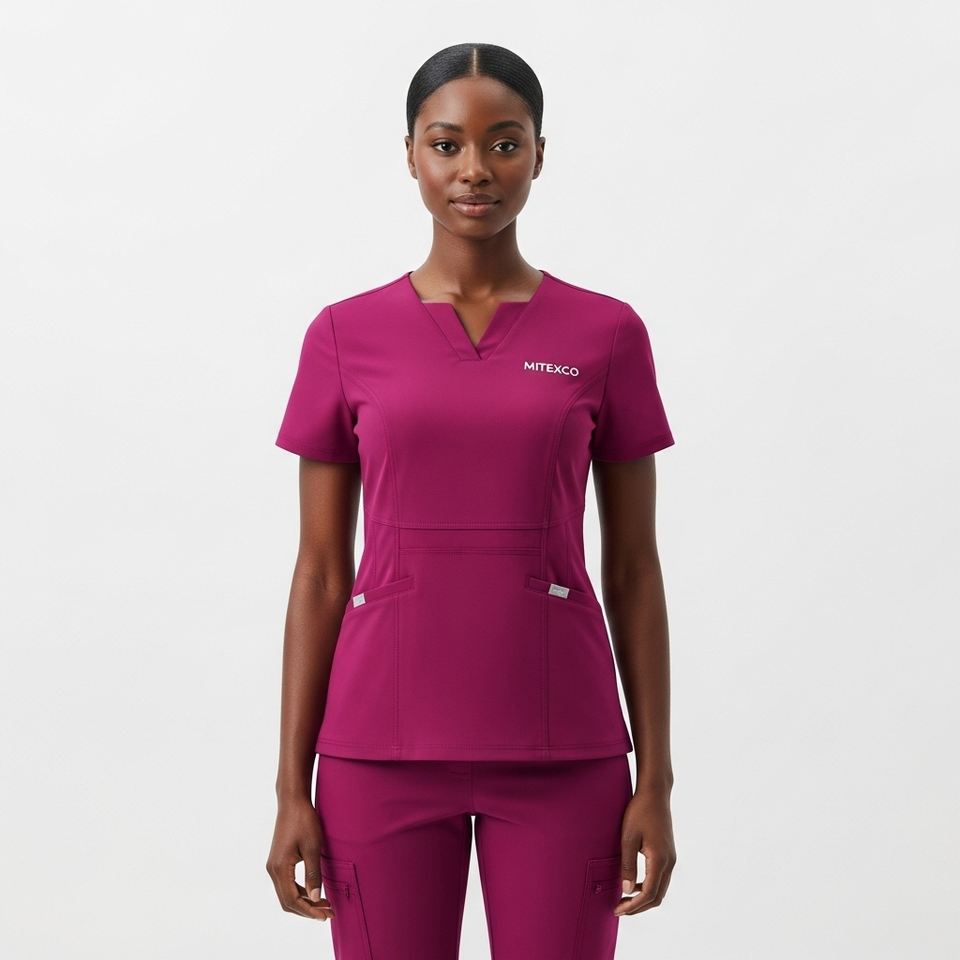 ชุดยูนิฟอร์มแพทย์ผู้หญิง MITEXCO รุ่นพรีเมียม สีม่วงแดง คอวี เสื้อแขนสั้นทันสมัย และกางเกงคาร์โก้ สำหรับโรงพยาบาล