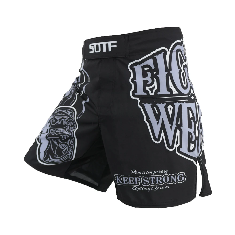 ชุดกีฬา MMA ลายพิมพ์เรขาคณิตสีดำ ตัวอักษรลายเสือ มวยไทย คิกบ็อกซิ่ง ชุดมวยไทย กางเกงมวยไทย ซานด้า MMA