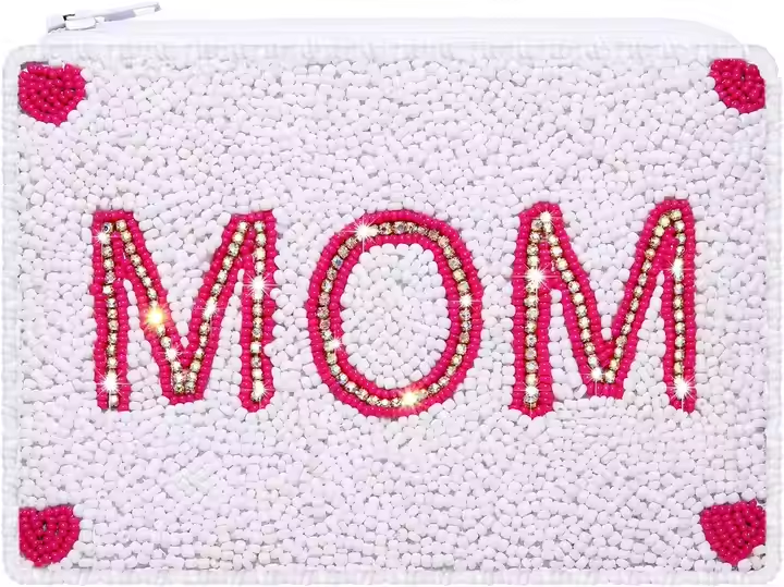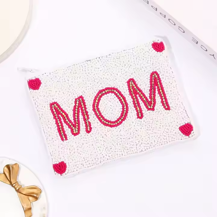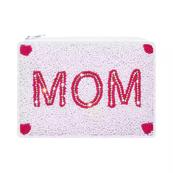 MOM Mini Zipper Pouch Wallet Beaded Coin Purse in Seed Bead Embroidery for Sports Day Birthday Gift