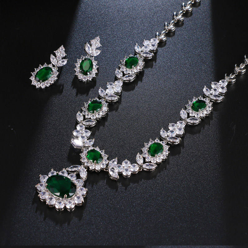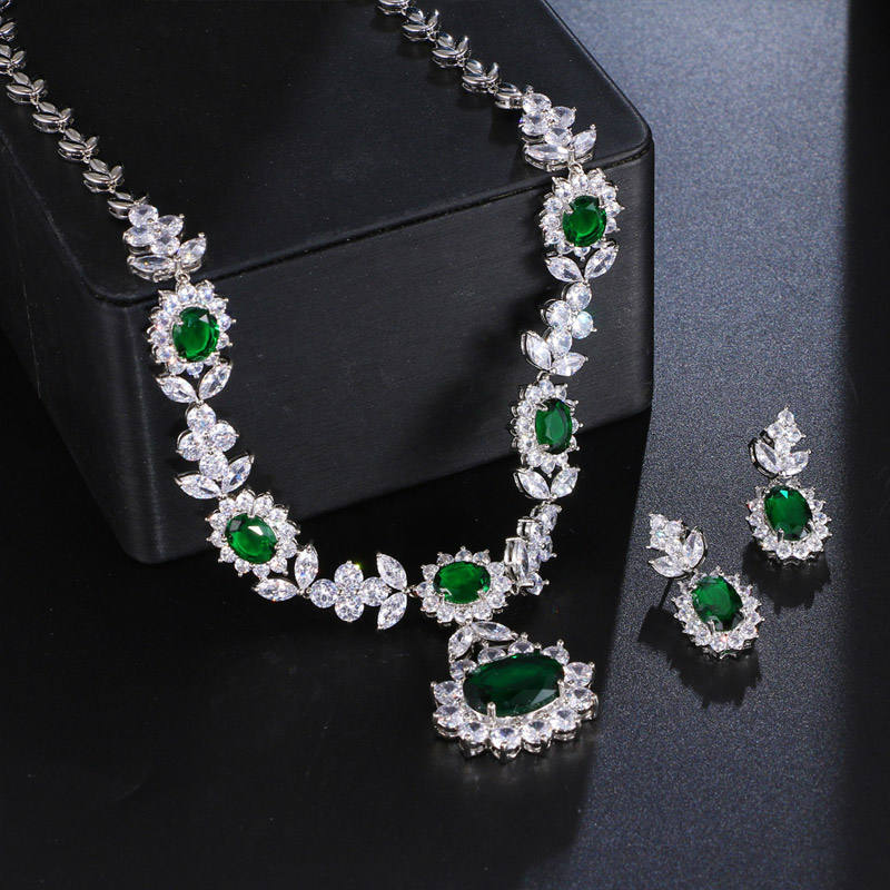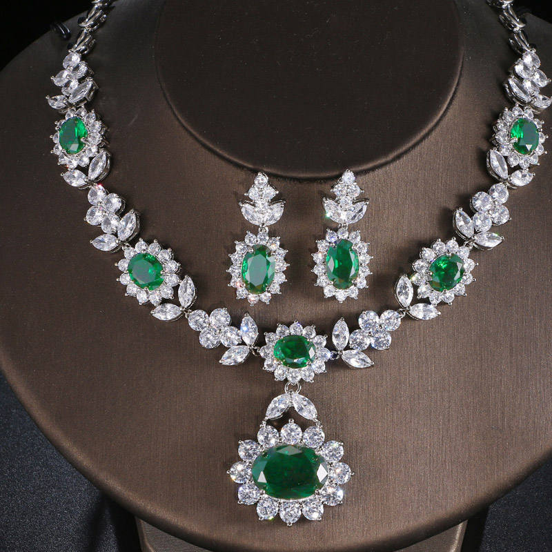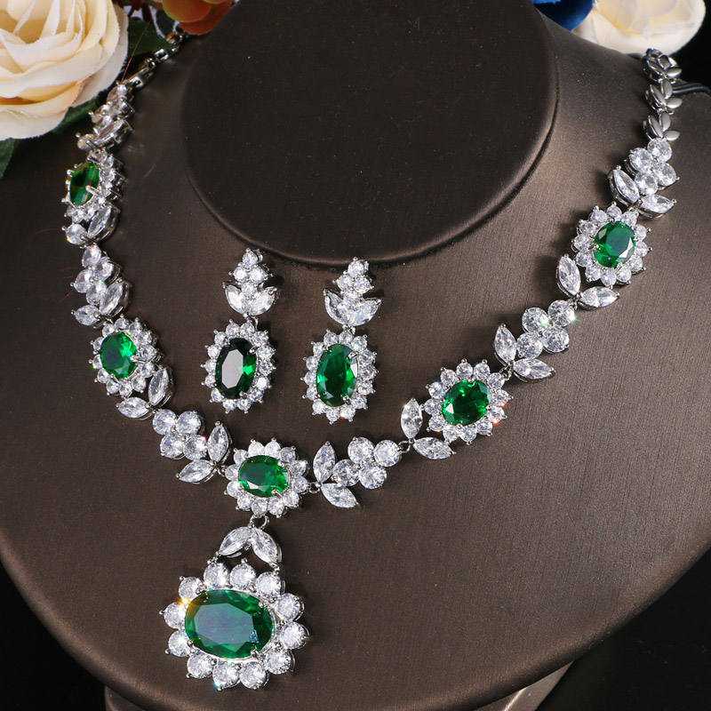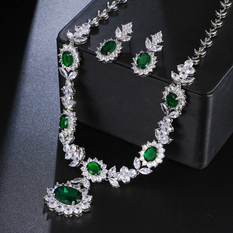 ต่างหูและสร้อยคอเซอร์คอนสีเขียวสไตล์โบฮีเมียนสำหรับผู้หญิงคริสเตียน ขายส่งขั้นต่ำ 2 ชิ้น เหมาะสำหรับงานแต่งงานและงานหมั้น