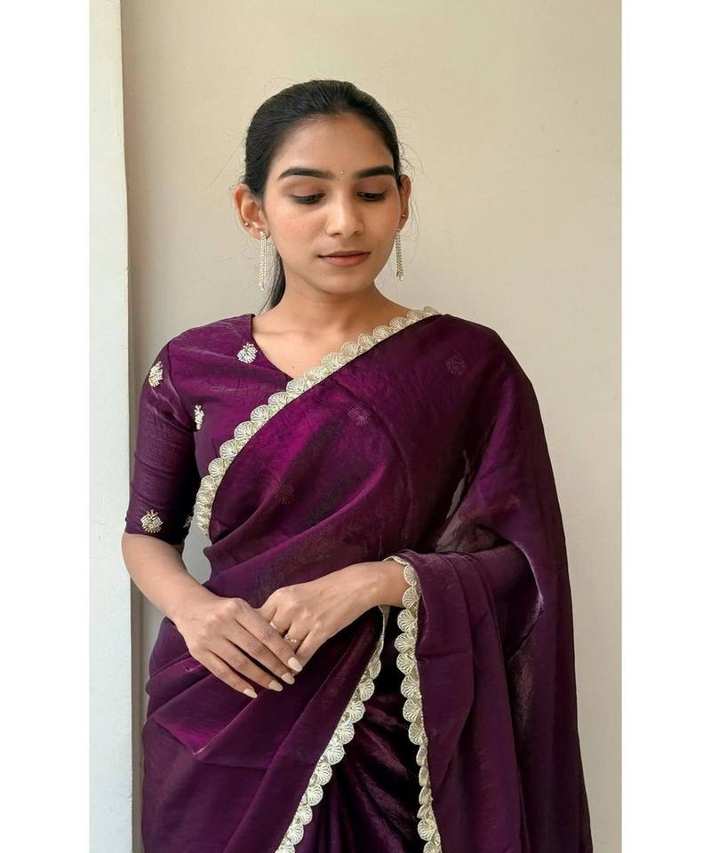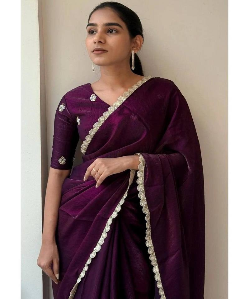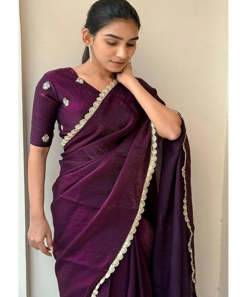 ผ้าส่าหรีทำงานขอบลูกไม้สีทองเรียงเป็นลำดับแบบผ้าไหมสำหรับงานปาร์ตี้