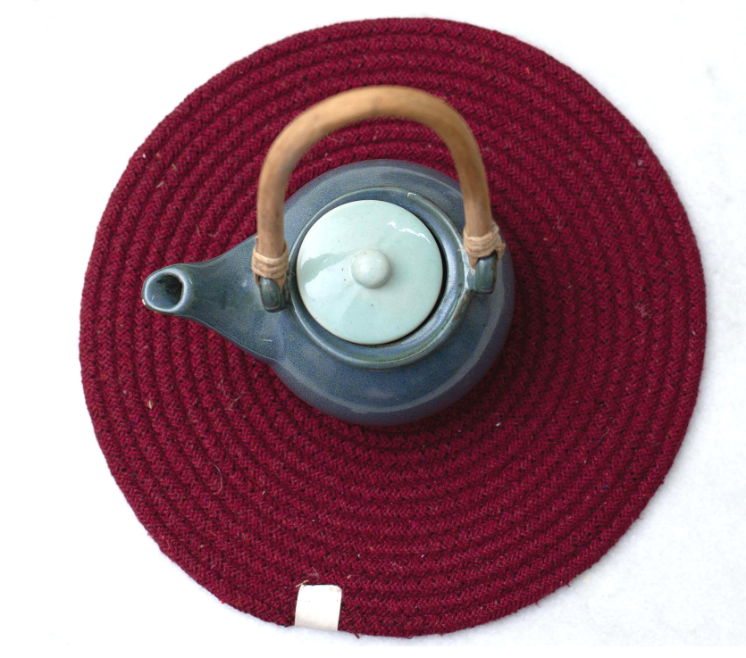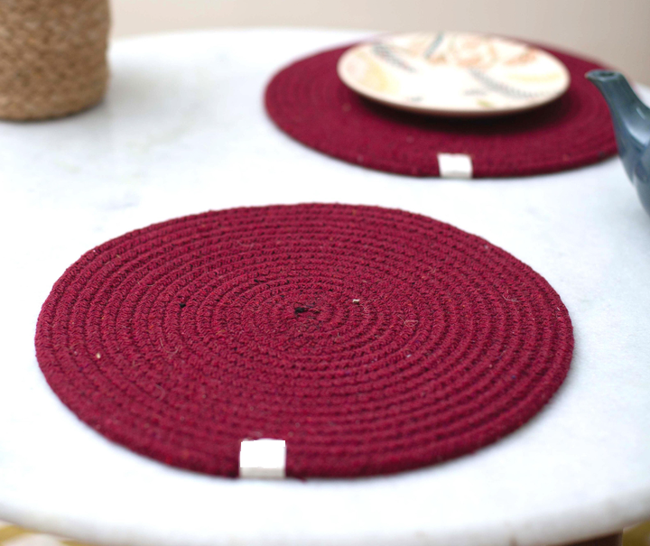 ชุดที่รองจานผ้าฝ้ายทรงกลมสีแดงเป็นมิตรกับสิ่งแวดล้อมชุดเสื่อรองจานถัก6ชิ้นขนาด15นิ้ว