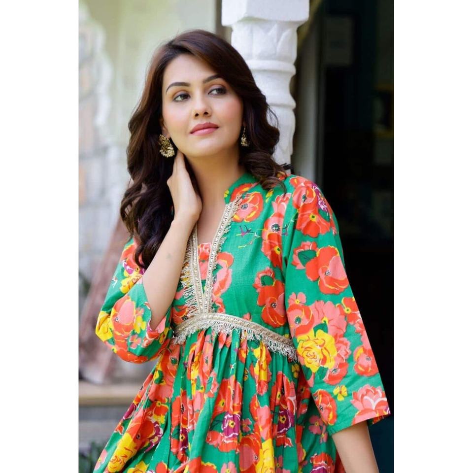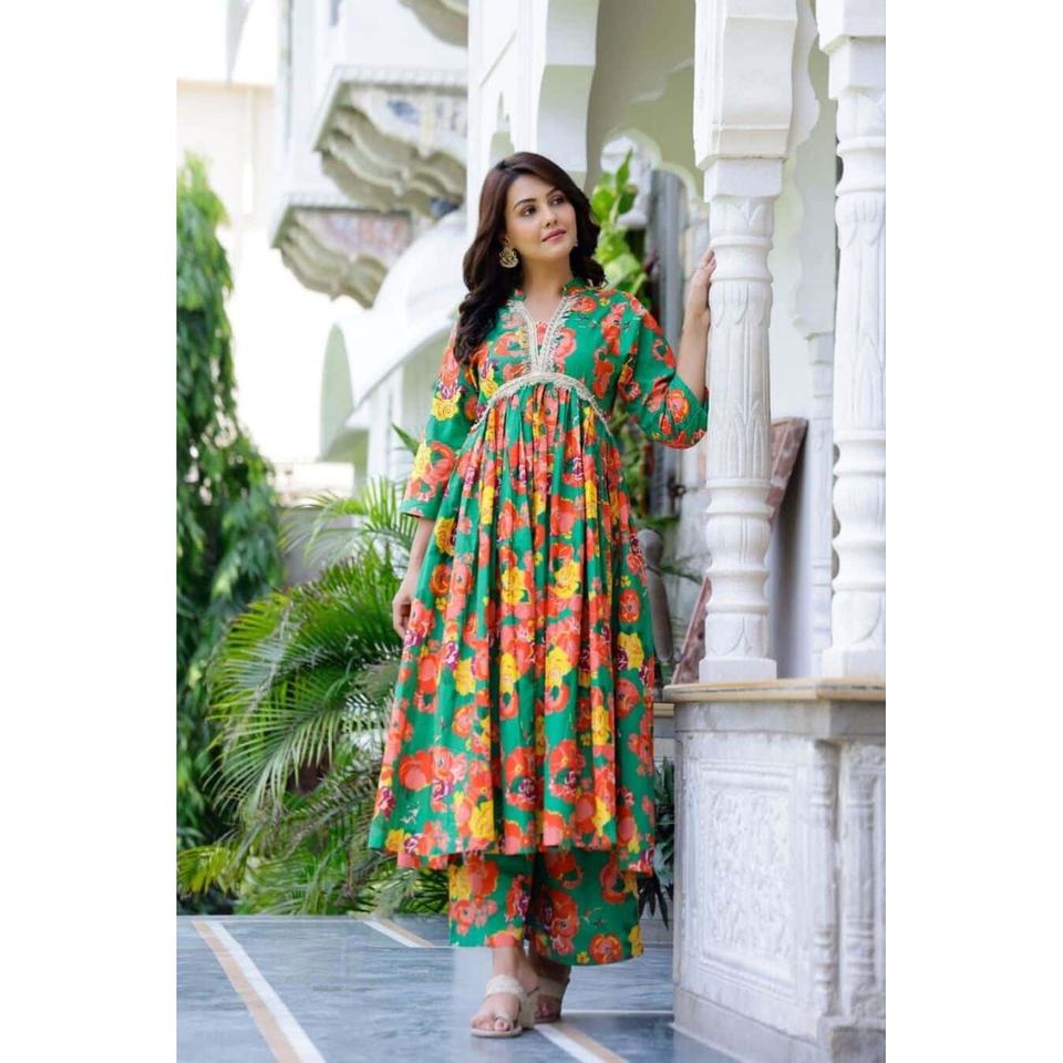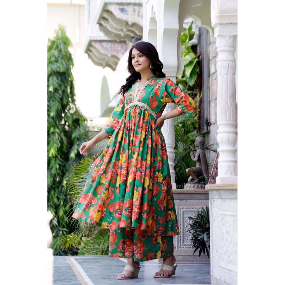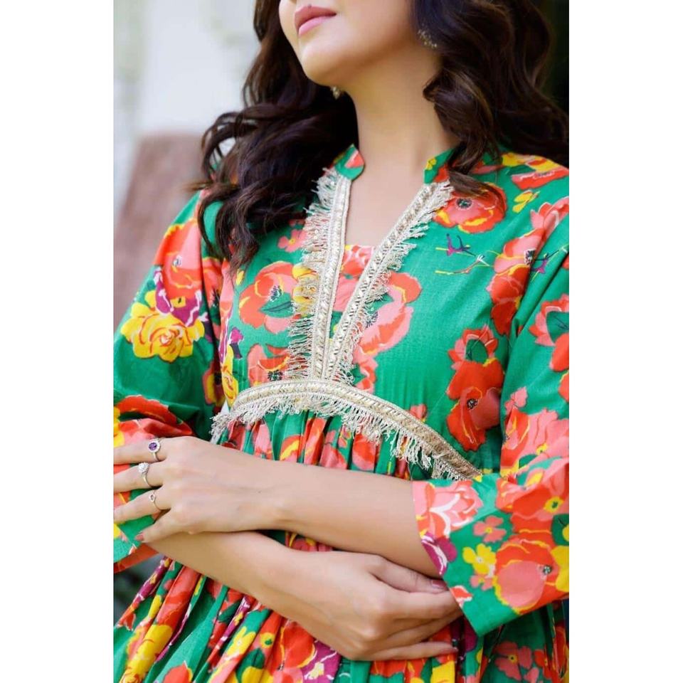 ชุดผ้าจอร์เจียที่ตัดเย็บด้วยสีเขียววังพร้อมพิมพ์ลาย
