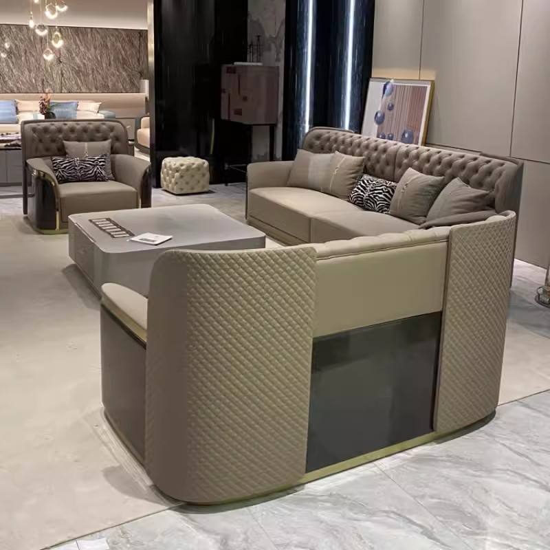 ชุดโซฟาหนังหัวเข็มขัดหลังสูงหรูหราแบบกำหนดเองสำหรับห้องนั่งเล่นชุดโซฟาไม้สำหรับเฟอร์นิเจอร์ในบ้านและโรงแรม
