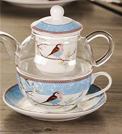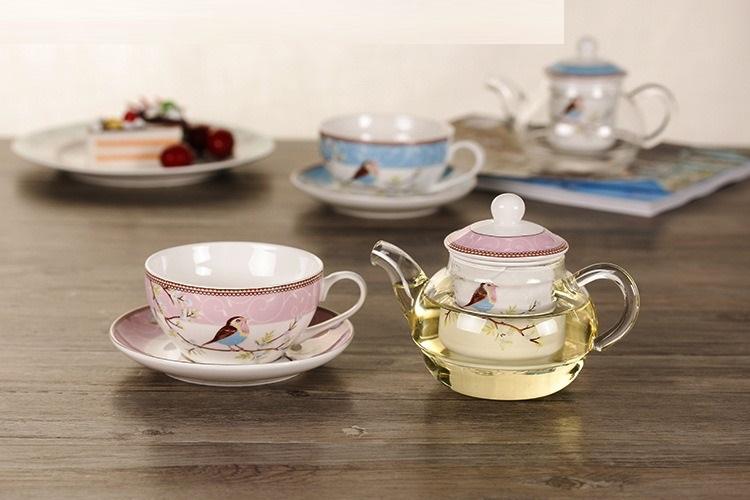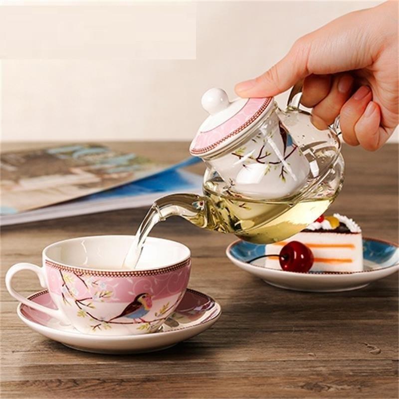 ชุดน้ำชายามบ่ายแบบเรียบง่ายหม้อเซรามิกลายดอกไม้และนกสีน้ำเงิน